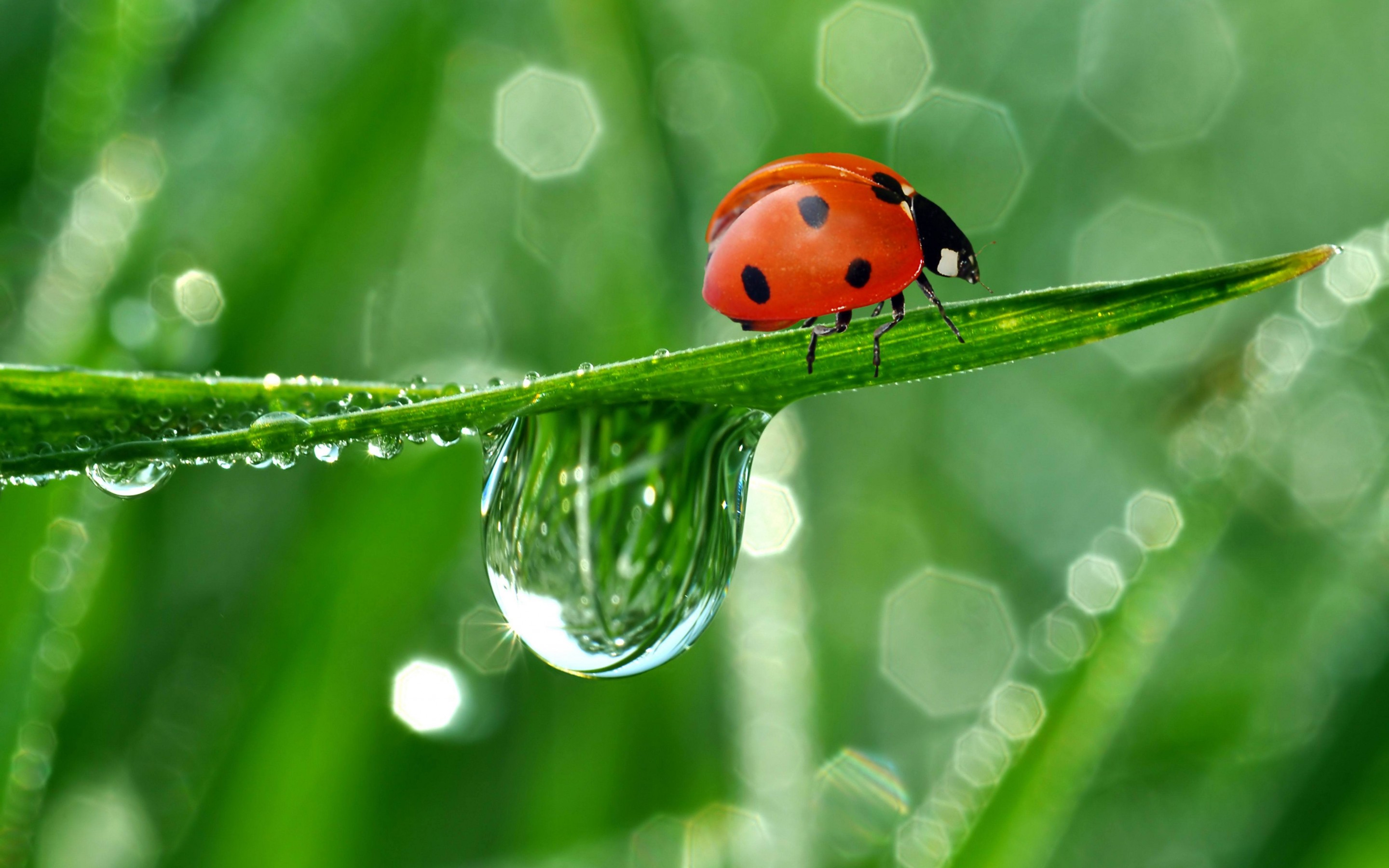 Description: A ladybug sitting on a green leaf with water droplets on it's surface and a green background.