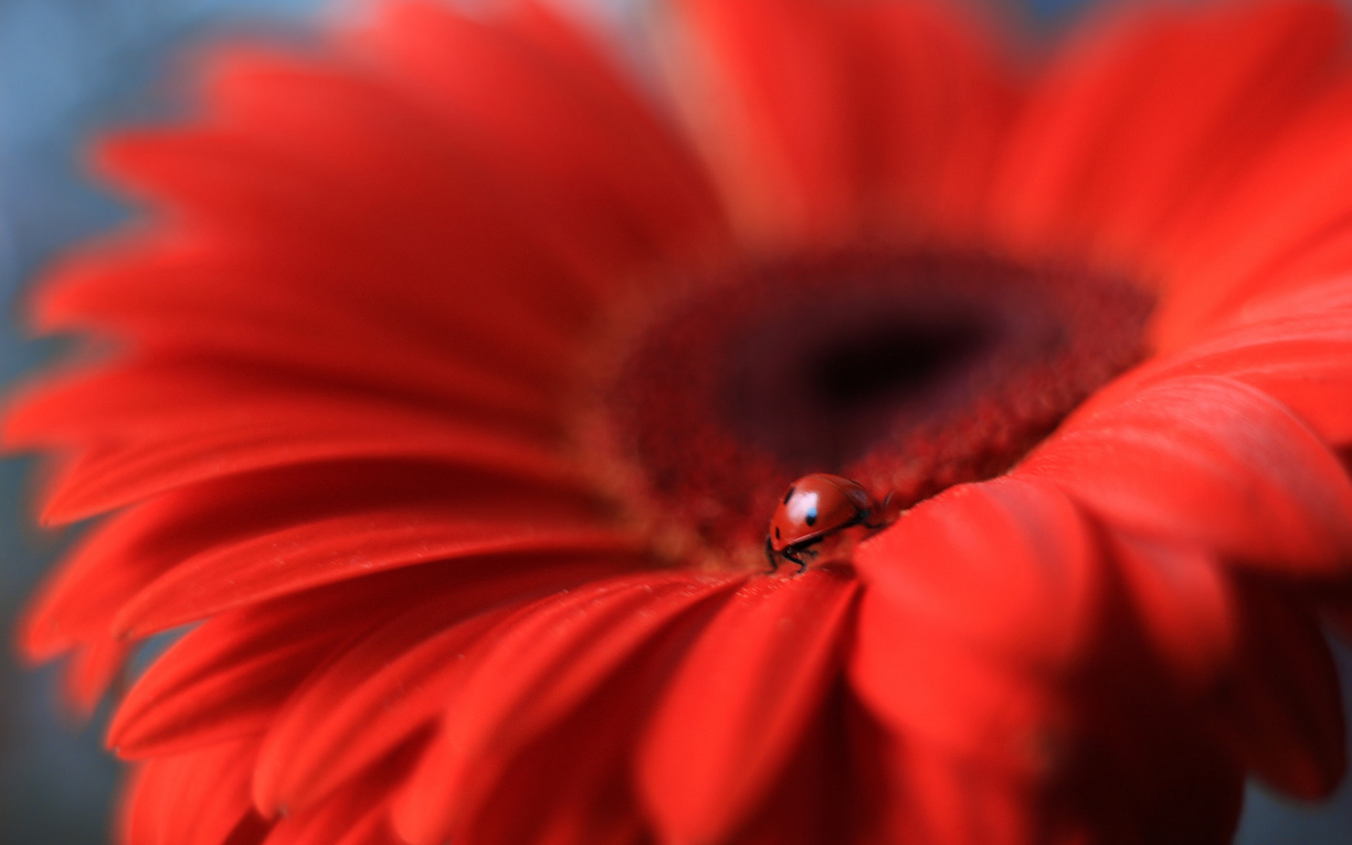 Description: A lady bug on a red flower with a blue background and a blurry background behind it.