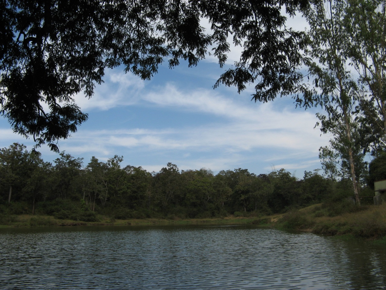 Description: A lake with a boat in it and trees around it and a sky background with clouds in the sky.