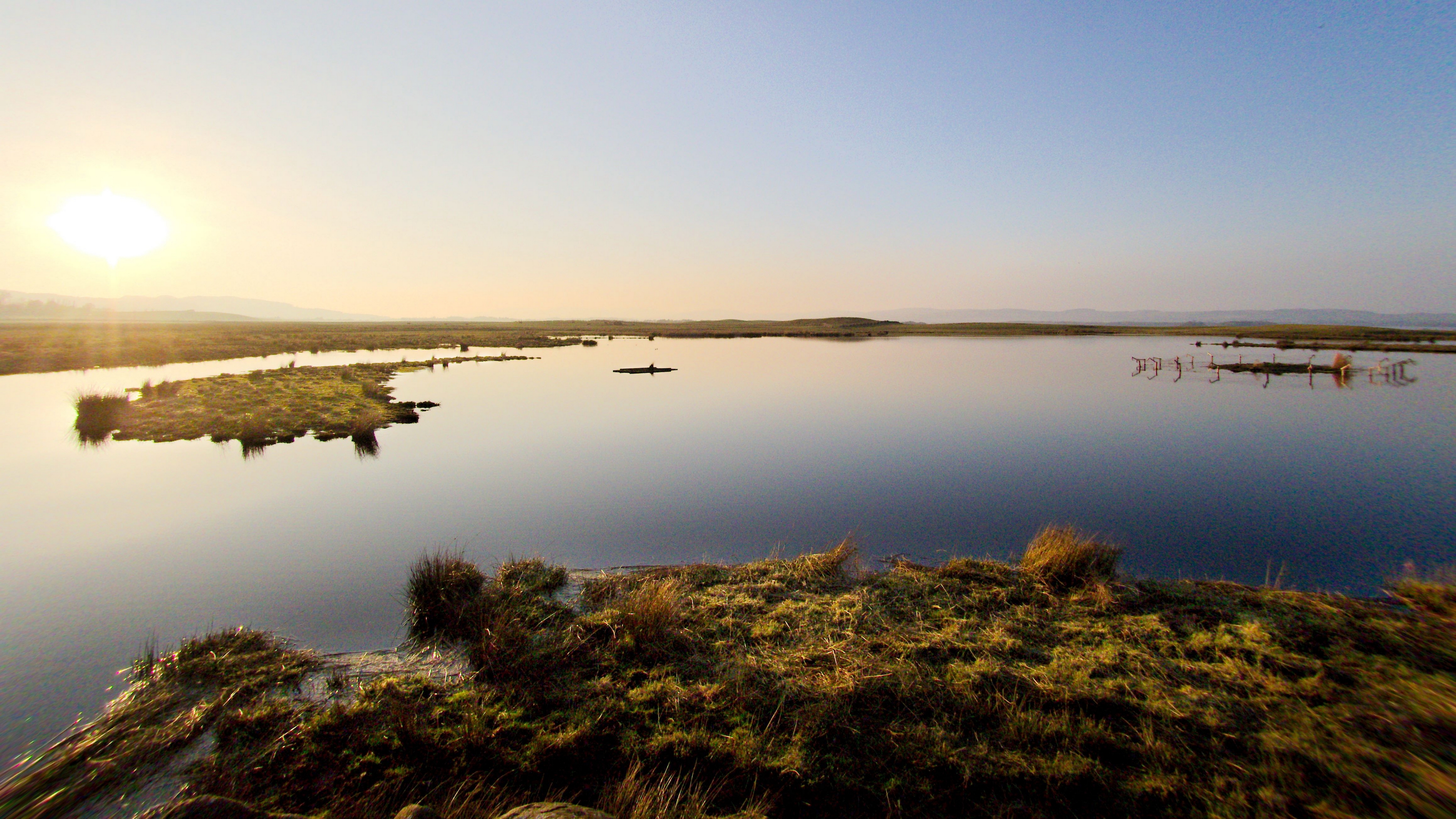 Description: A lake with a few boats in it and a sun in the background with a few clouds in the sky.