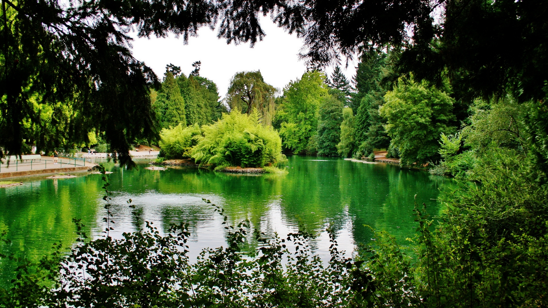 Description: A lake surrounded by trees and a bridge in the background with a bridge in the middle of the lake.