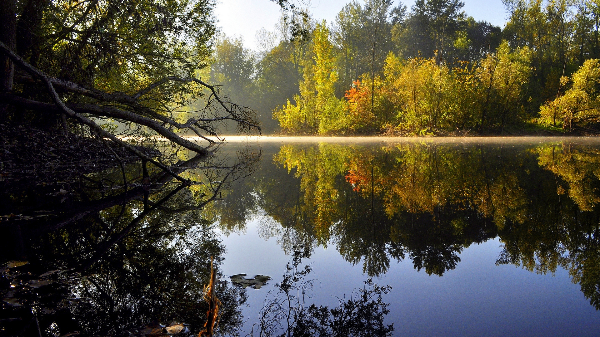 Description: A lake surrounded by trees and fog in the sky with a boat in the water on the lake shore.