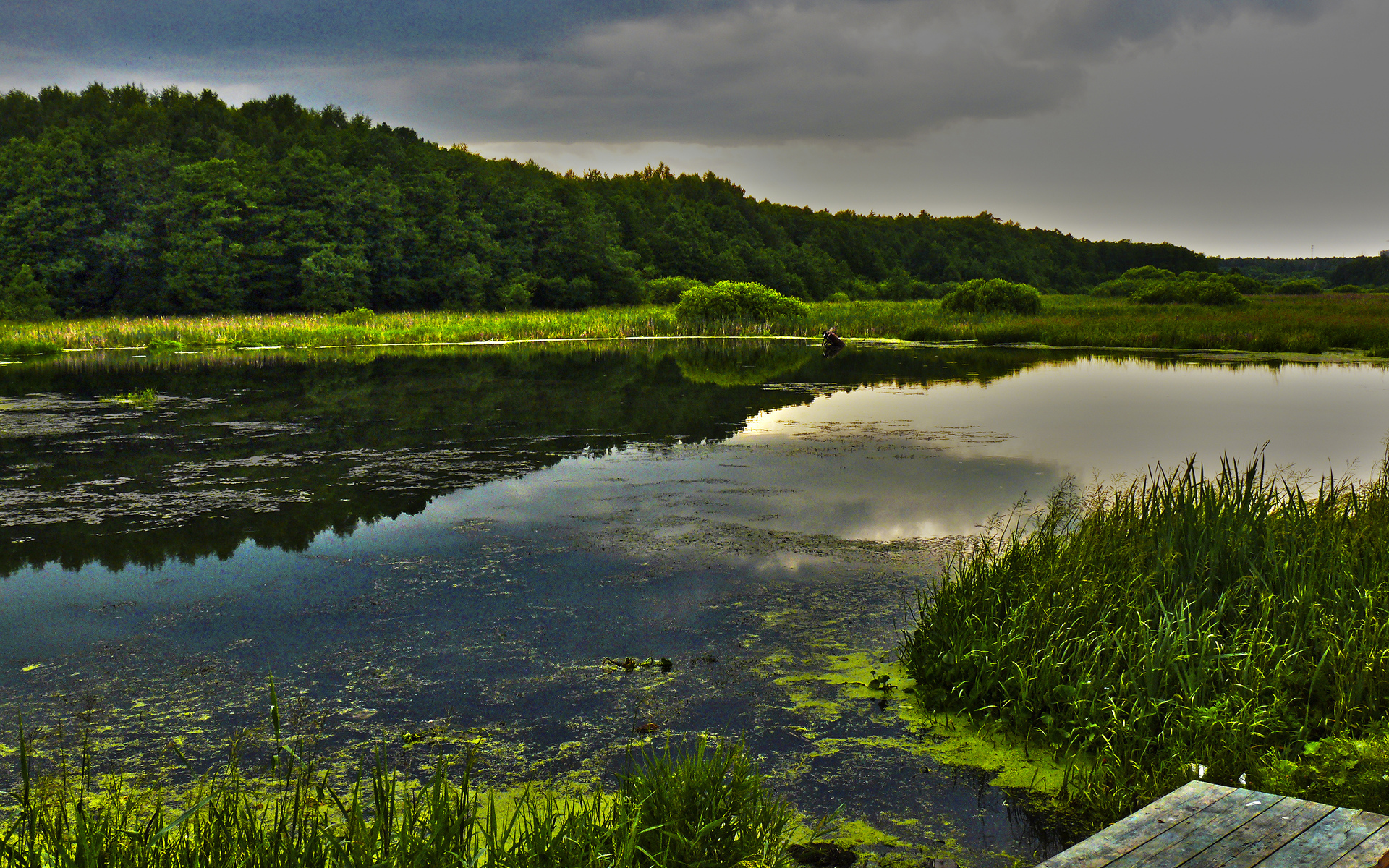 Description: A lake surrounded by a forest with a bench in the foreground and a cloudy sky above it with a few clouds.