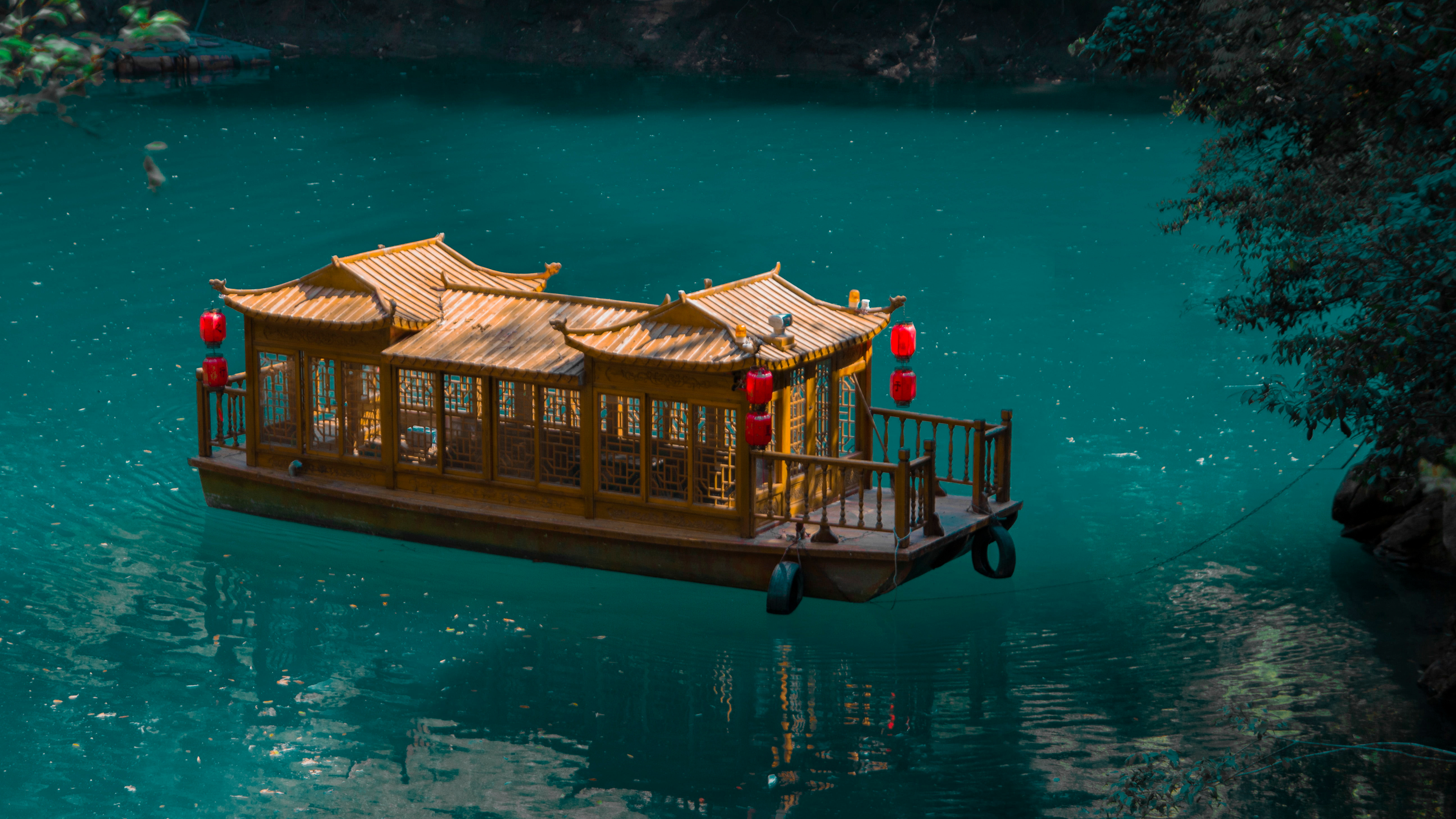 Description: A boat floating on top of a lake filled with water next to a forest covered hillside with trees and bushes.