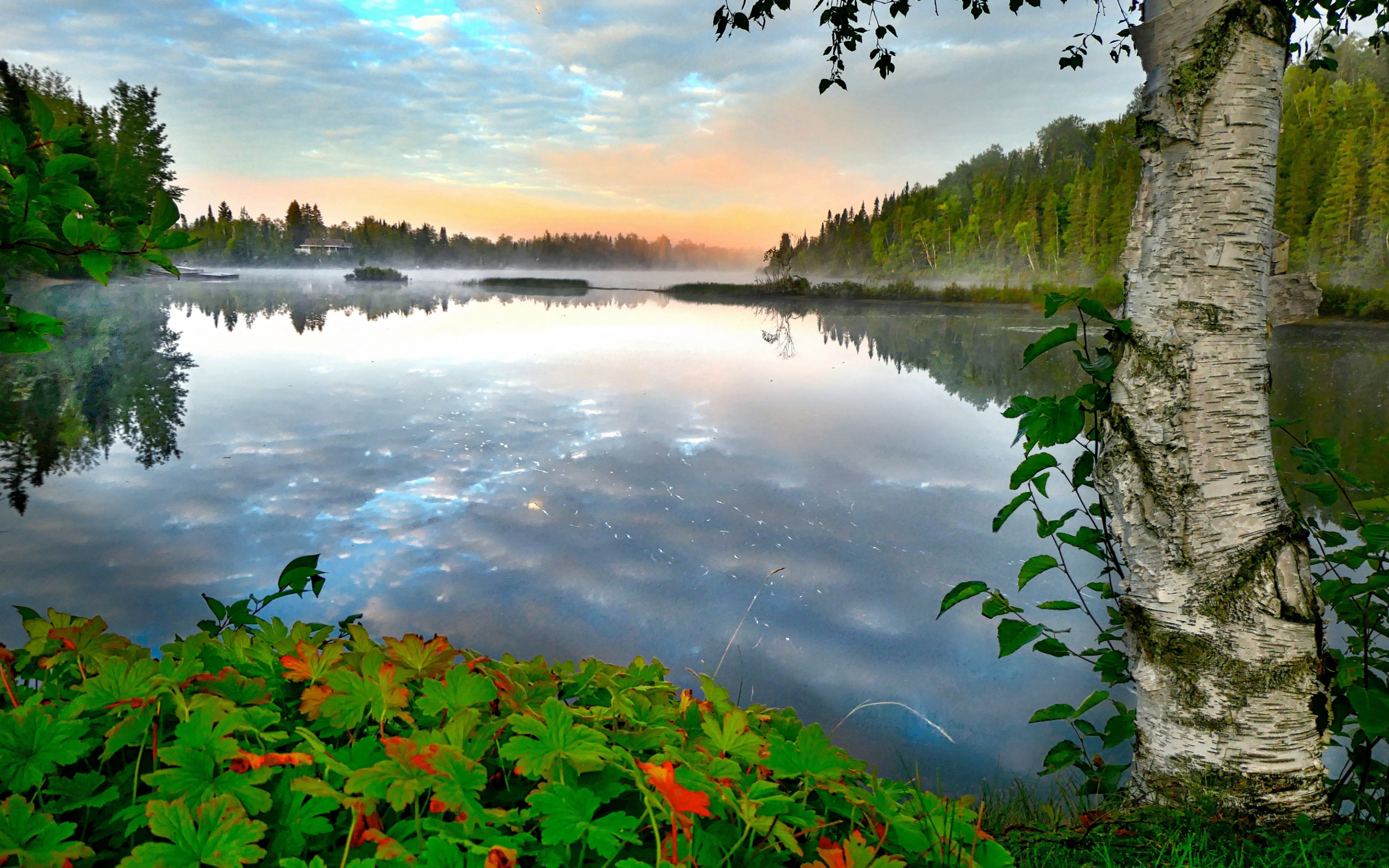 Description: A lake surrounded by trees and a forest with a sky background and clouds in the sky and a few trees.