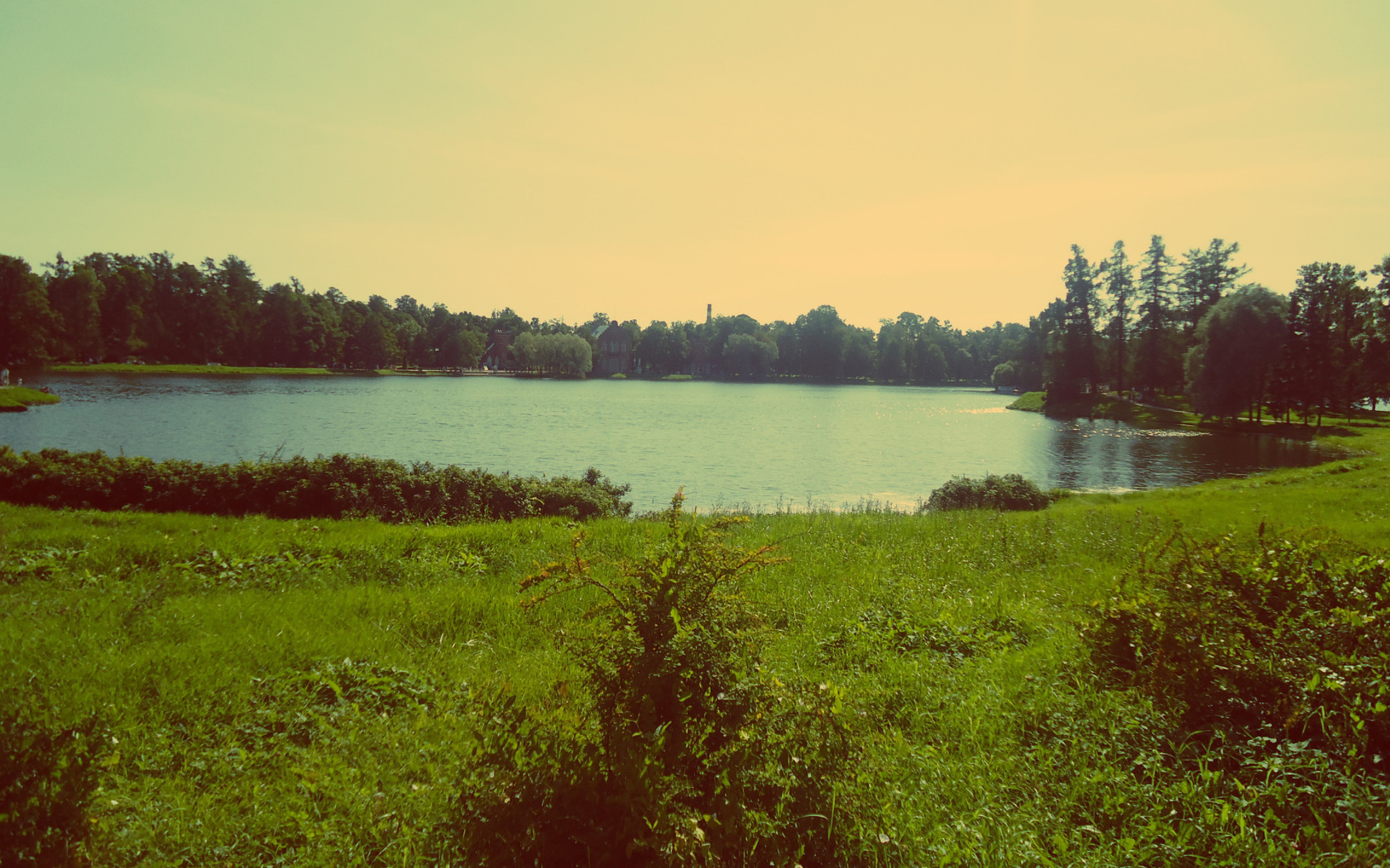 Description: A lake surrounded by lush green grass and trees in the background with a blue sky in the background and a few clouds in the sky.