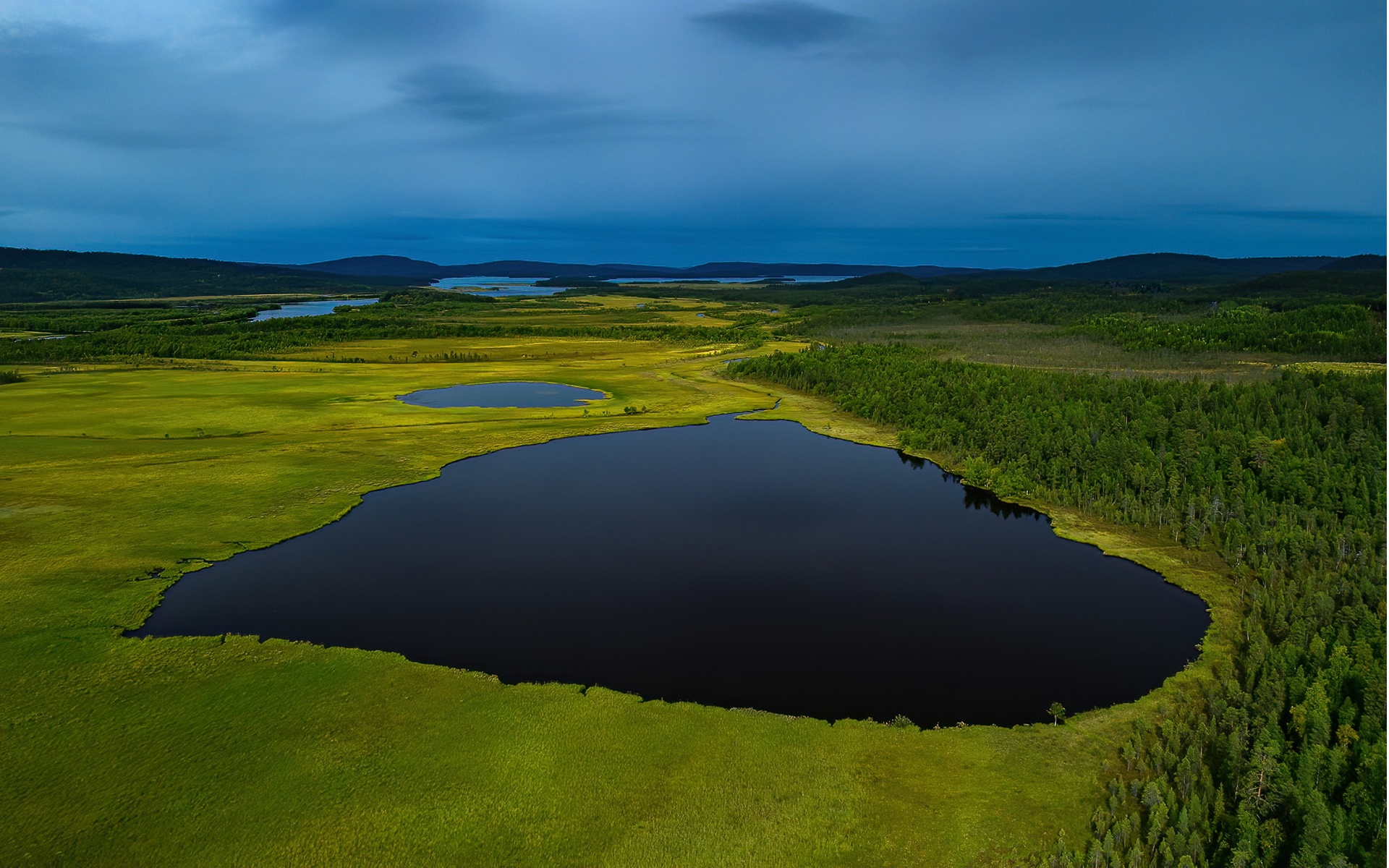 Description: A large body of water surrounded by a lush green field and forest under a cloudy sky with clouds in the distance.