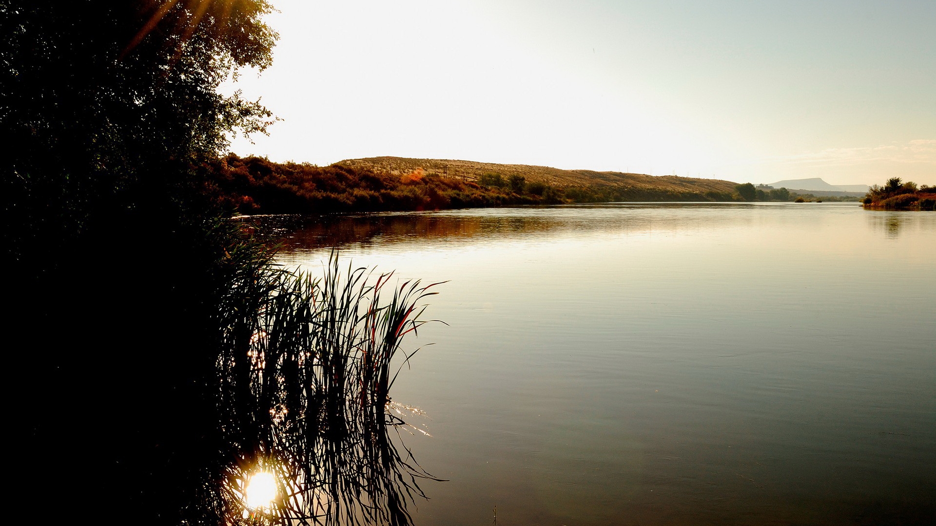 Description: A lake with a few trees and a hill in the background with the sun shining on the water and grass in the foreground.