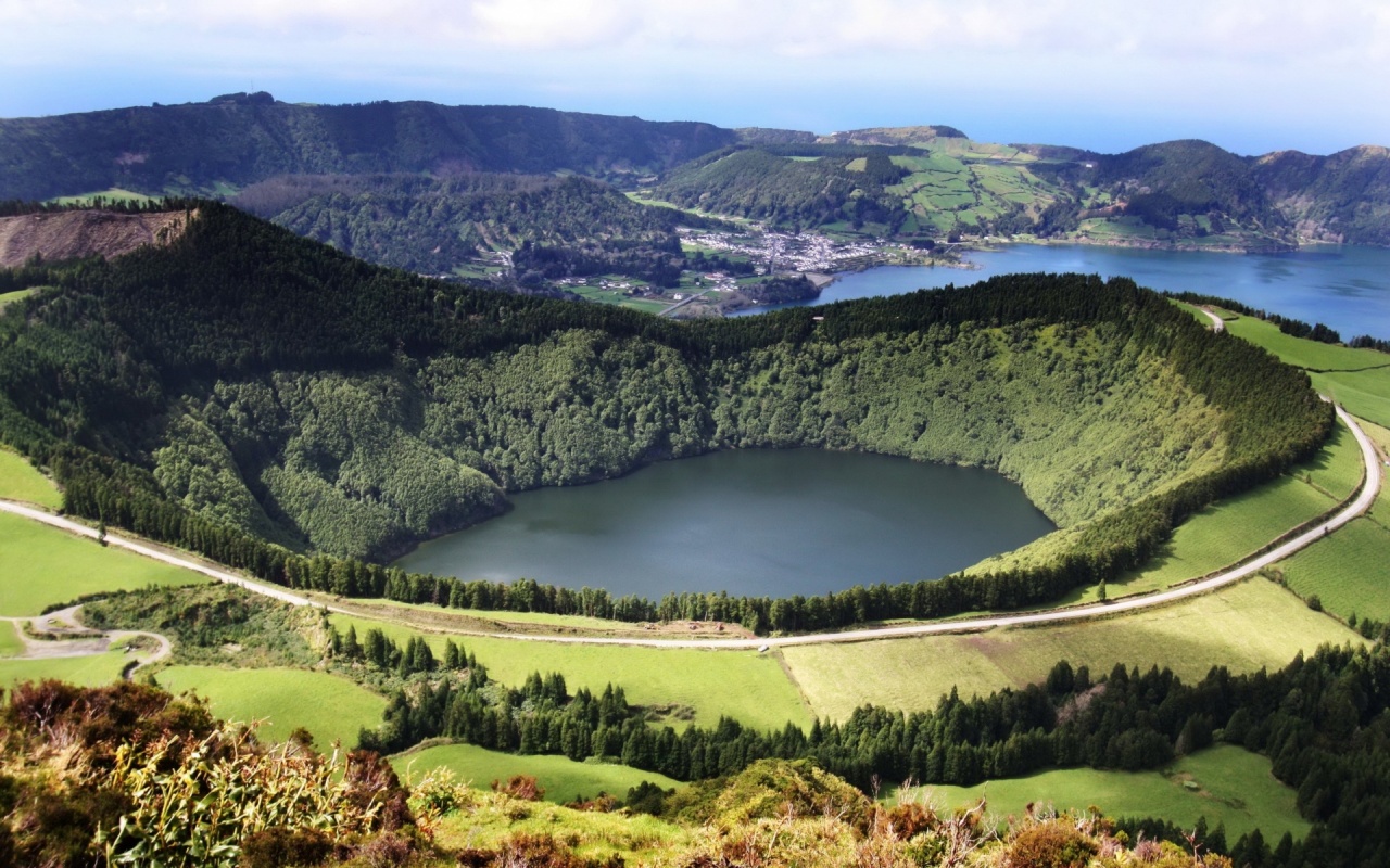 Description: A large lake surrounded by lush green hills and a road running through it's center surrounded by trees.