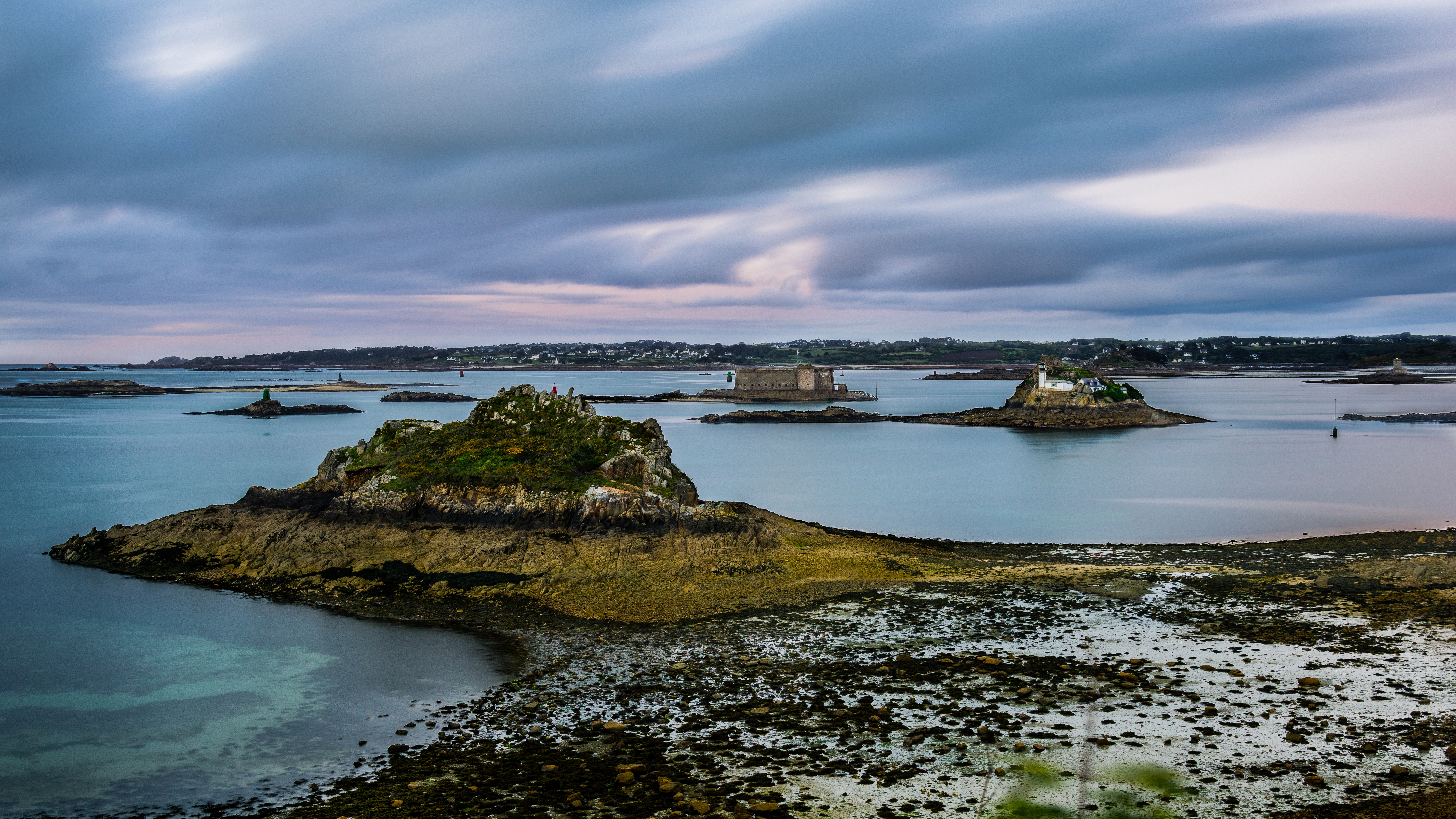 Description: A large body of water with a small island in the middle of it and a cloudy sky above it.