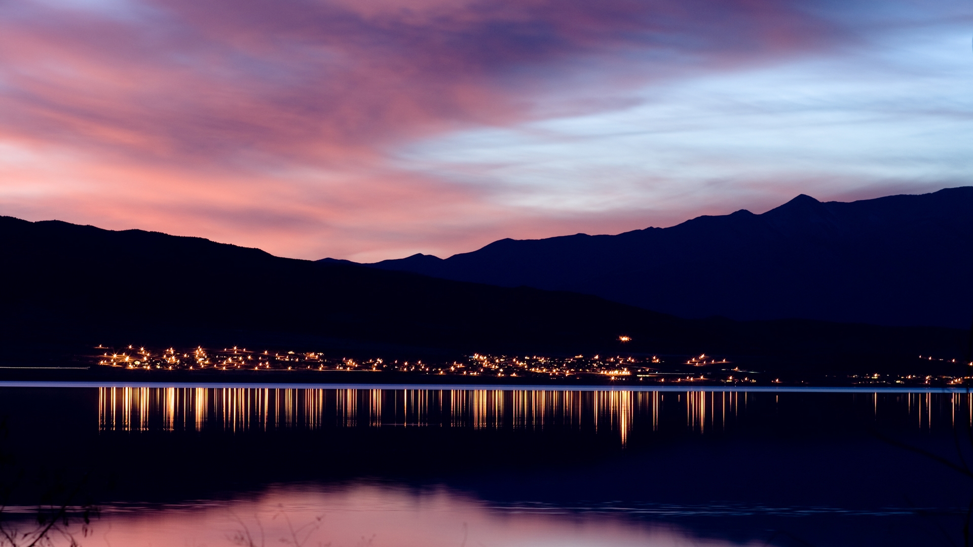 Description: A lake with a mountain in the background and a city in the distance at night time with a pink sky.