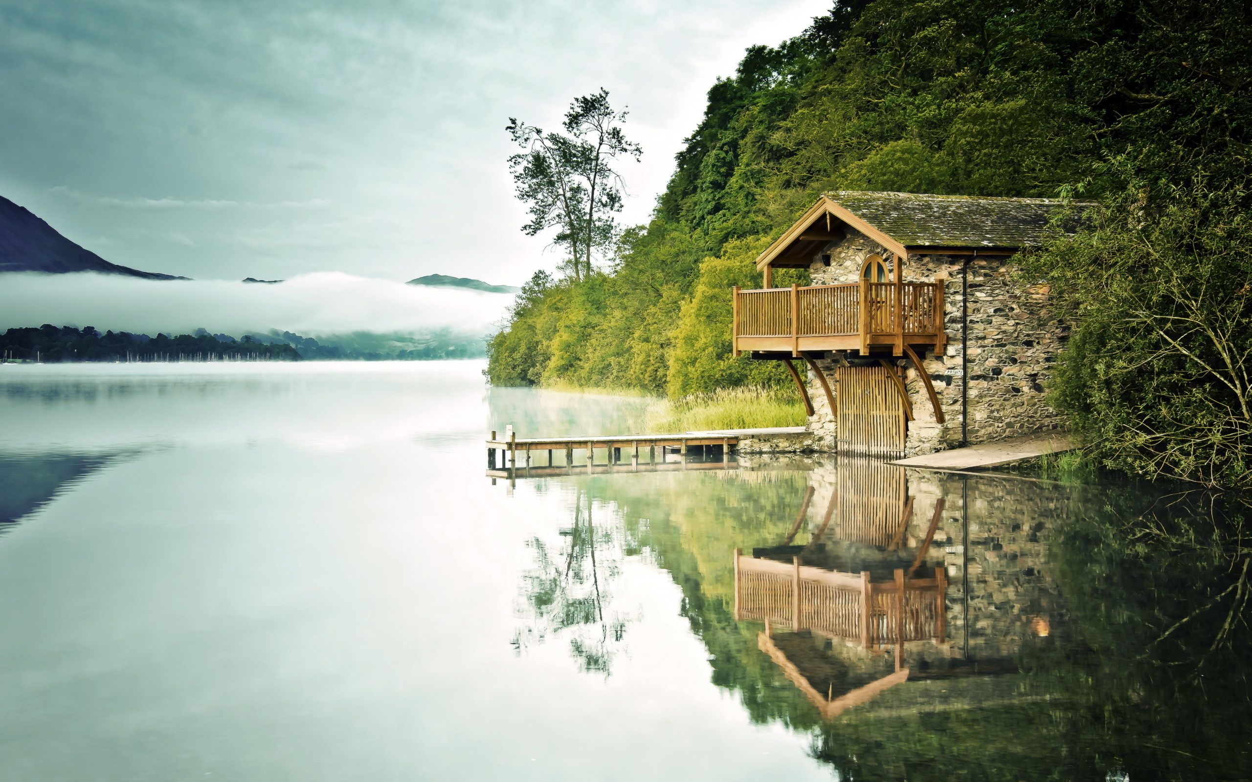 Description: A house on a lake with a dock and a mountain in the background with clouds in the sky and a foggy sky.