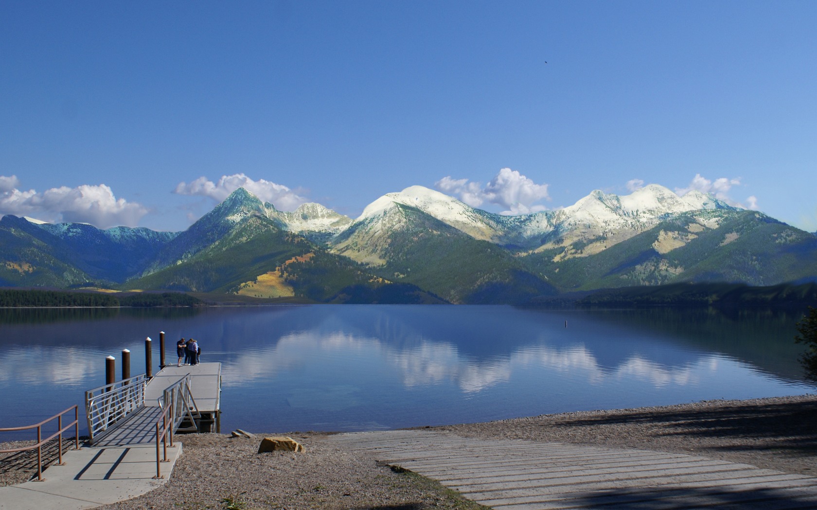 Description: A lake with mountains in the background and a wooden dock in the foreground with steps leading to it.