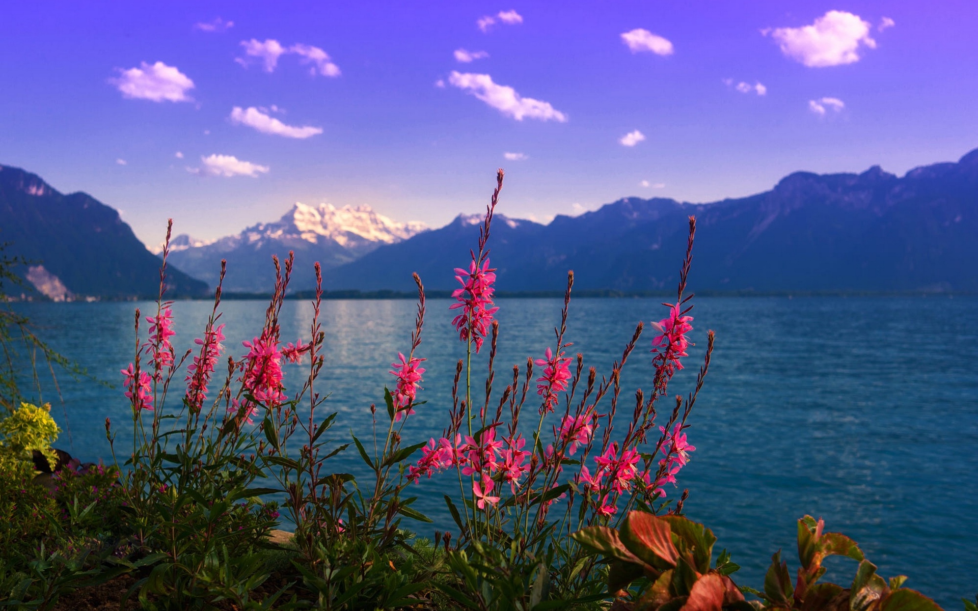 Description: A lake with mountains in the background and pink flowers in the foreground with a blue sky with clouds.
