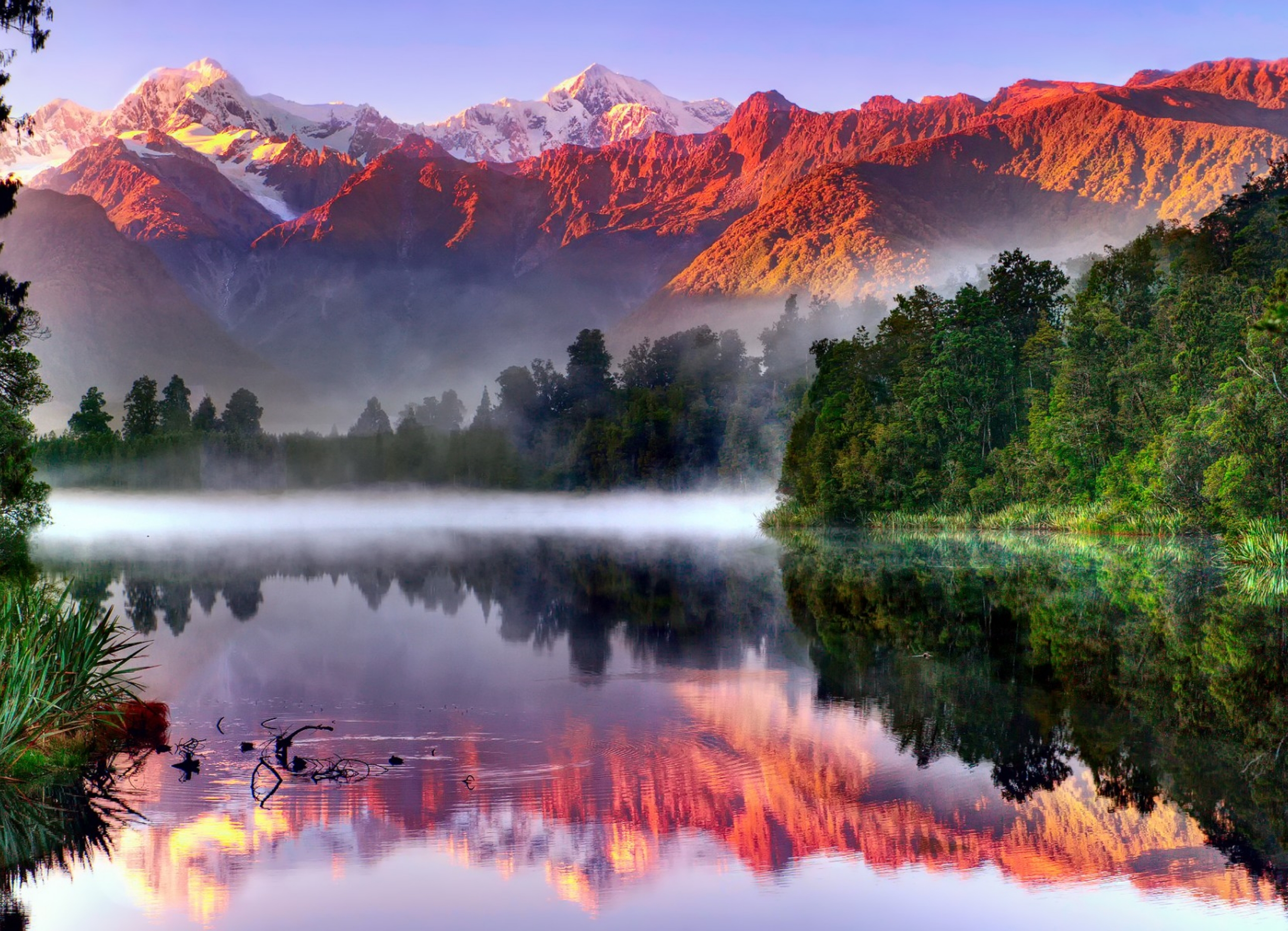 Description: A lake surrounded by mountains with a foggy sky in the background and a few ducks floating in the water.