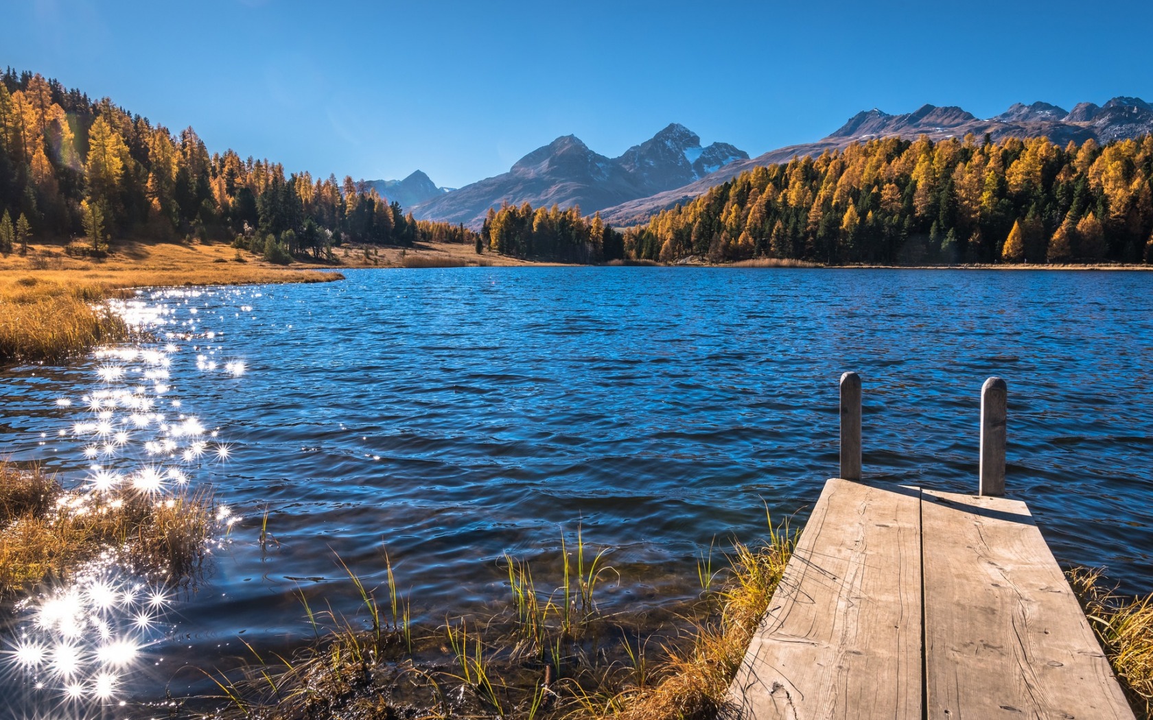 Description: A dock on a lake with mountains in the background and trees in the foreground.