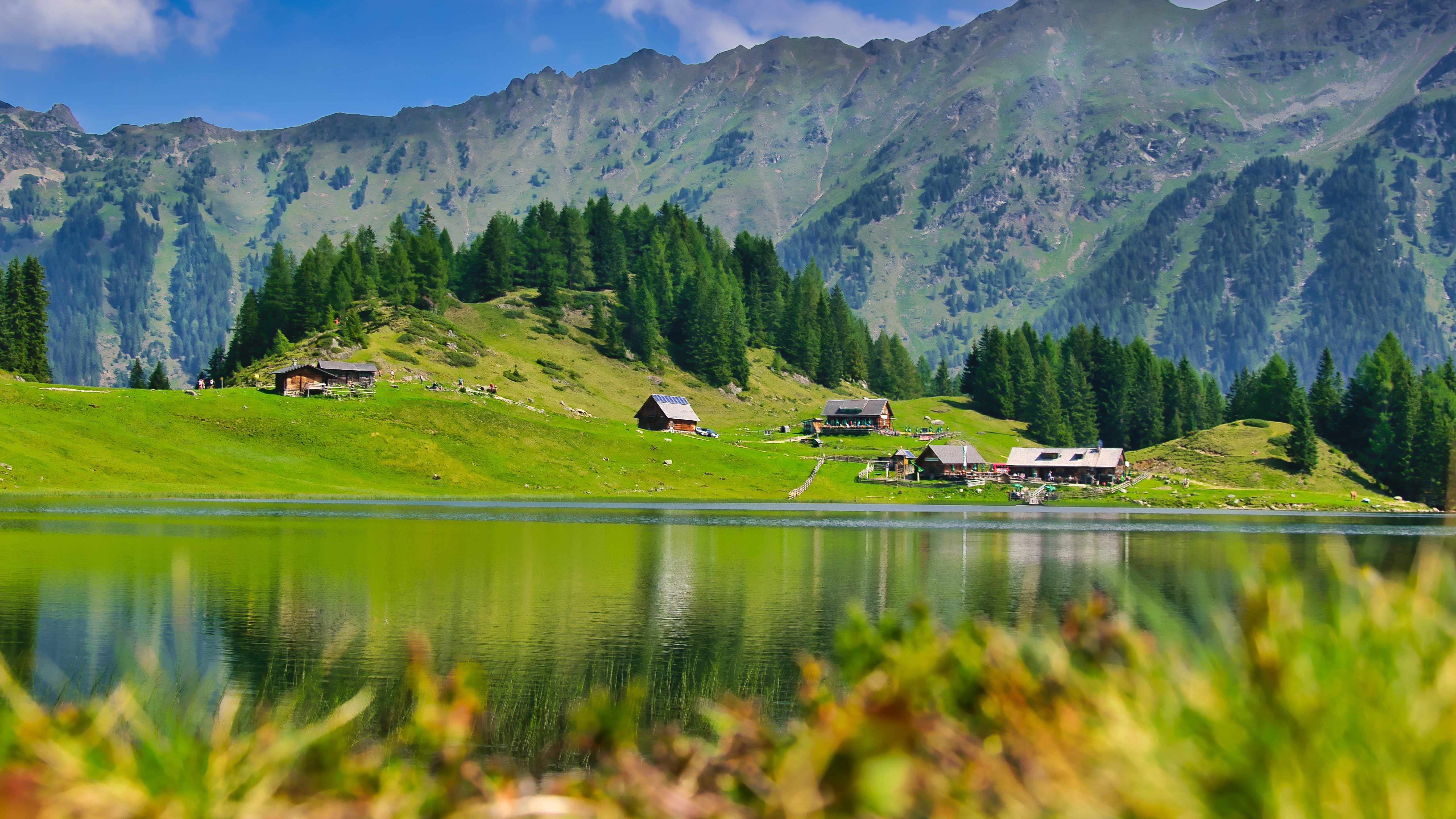 Description: A lake surrounded by mountains and a forest with a few houses on it and a few trees on the side.