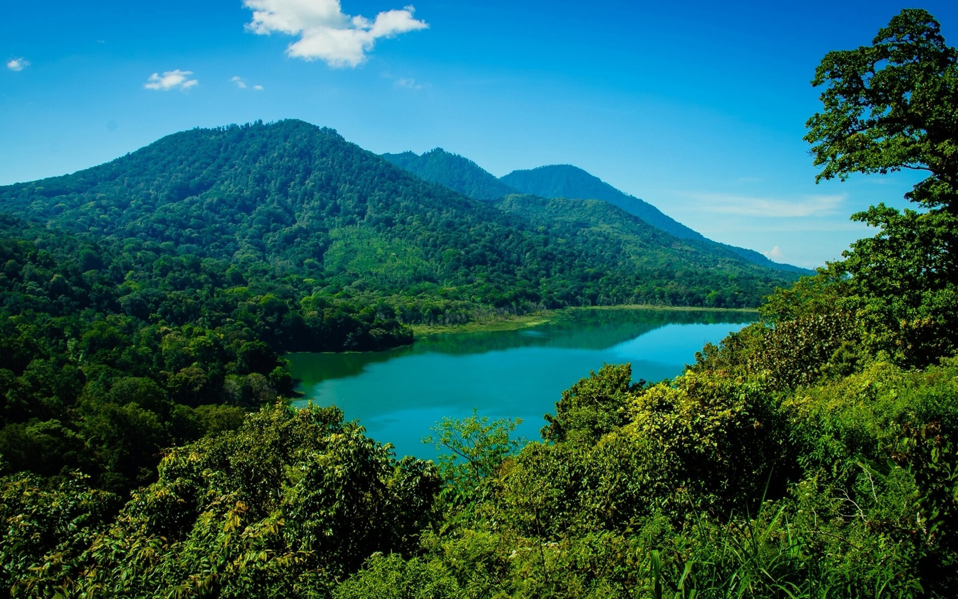 Description: A lake surrounded by lush green trees and mountains in the background with a blue sky and clouds in the distance.