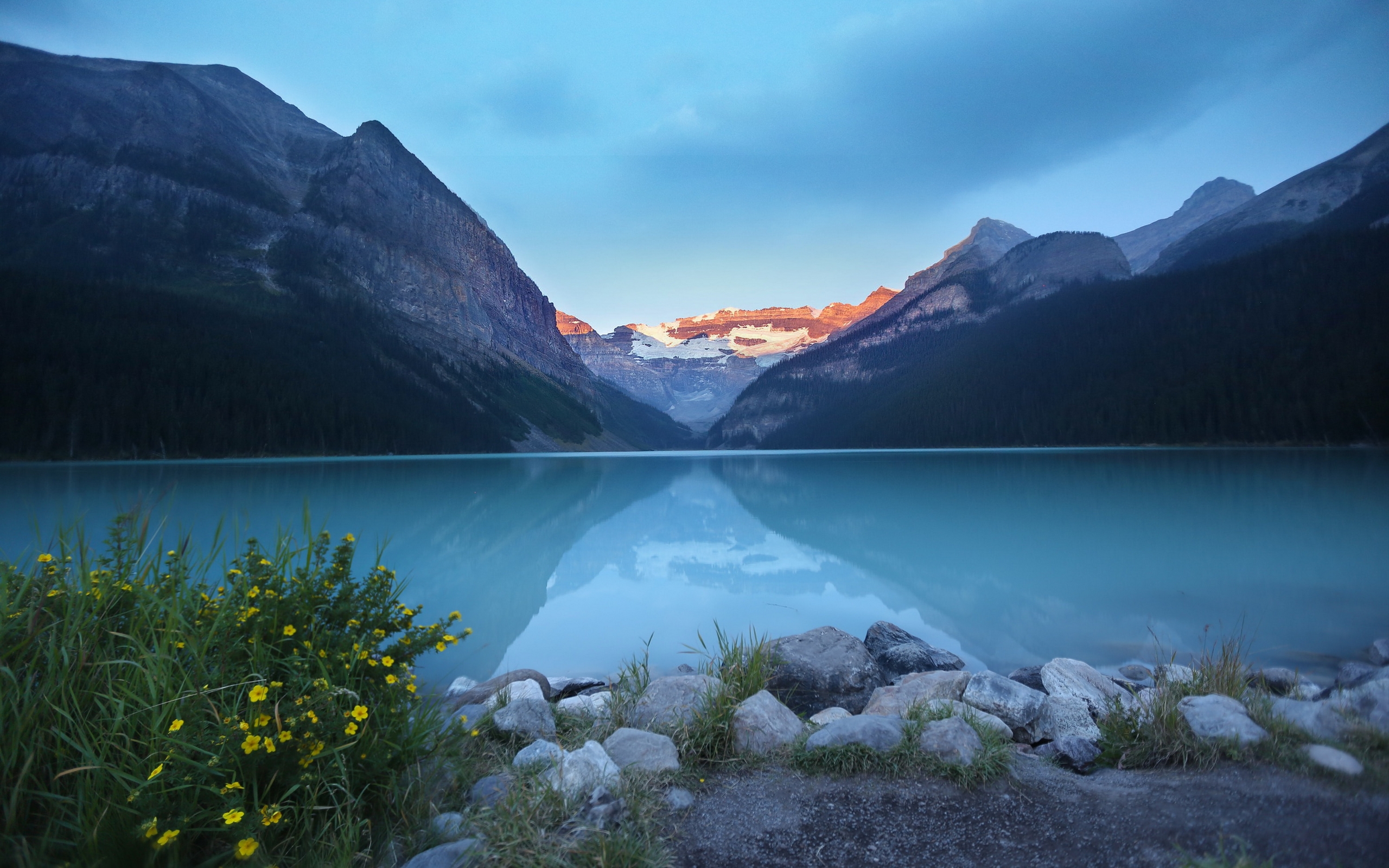 Description: A lake surrounded by mountains and a forest at sunset with a few clouds in the sky and a few flowers in the foreground.
