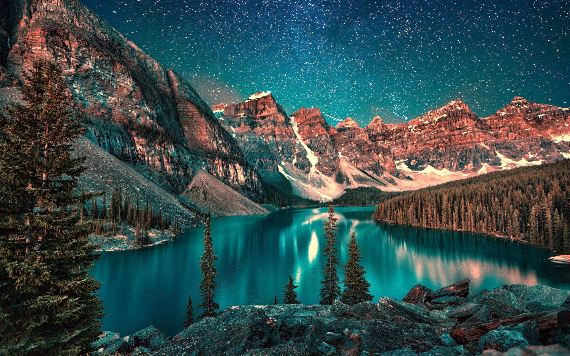 Description: A lake surrounded by mountains under a night sky with stars above it and a forest below it with rocks and trees.
