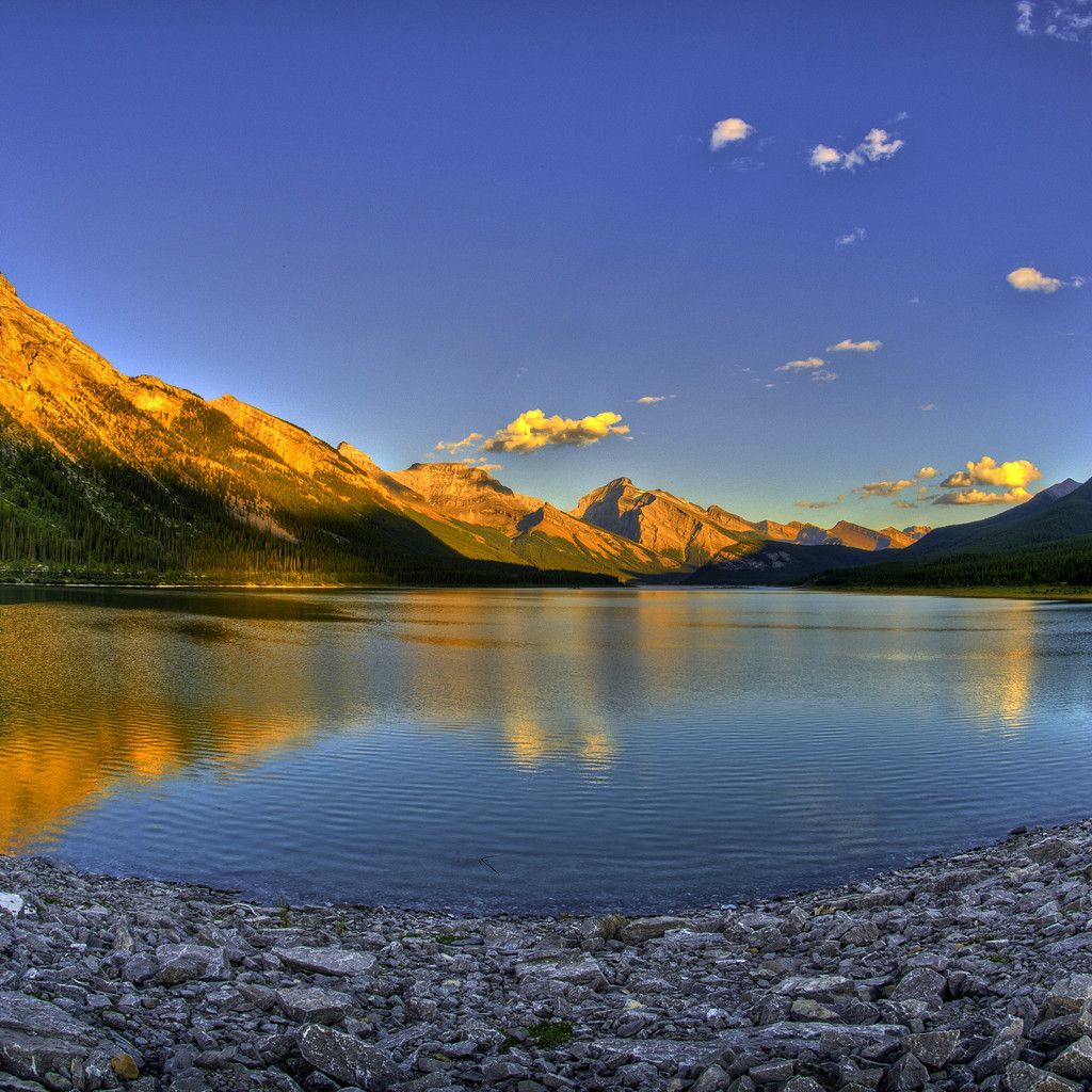 Description: A lake surrounded by mountains and rocks under a blue sky with clouds and sun shining on the mountains and water.