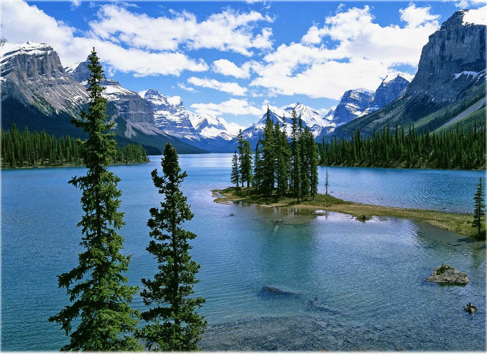 Description: A lake surrounded by mountains and trees with a blue sky and clouds above it and a few trees in the foreground.
