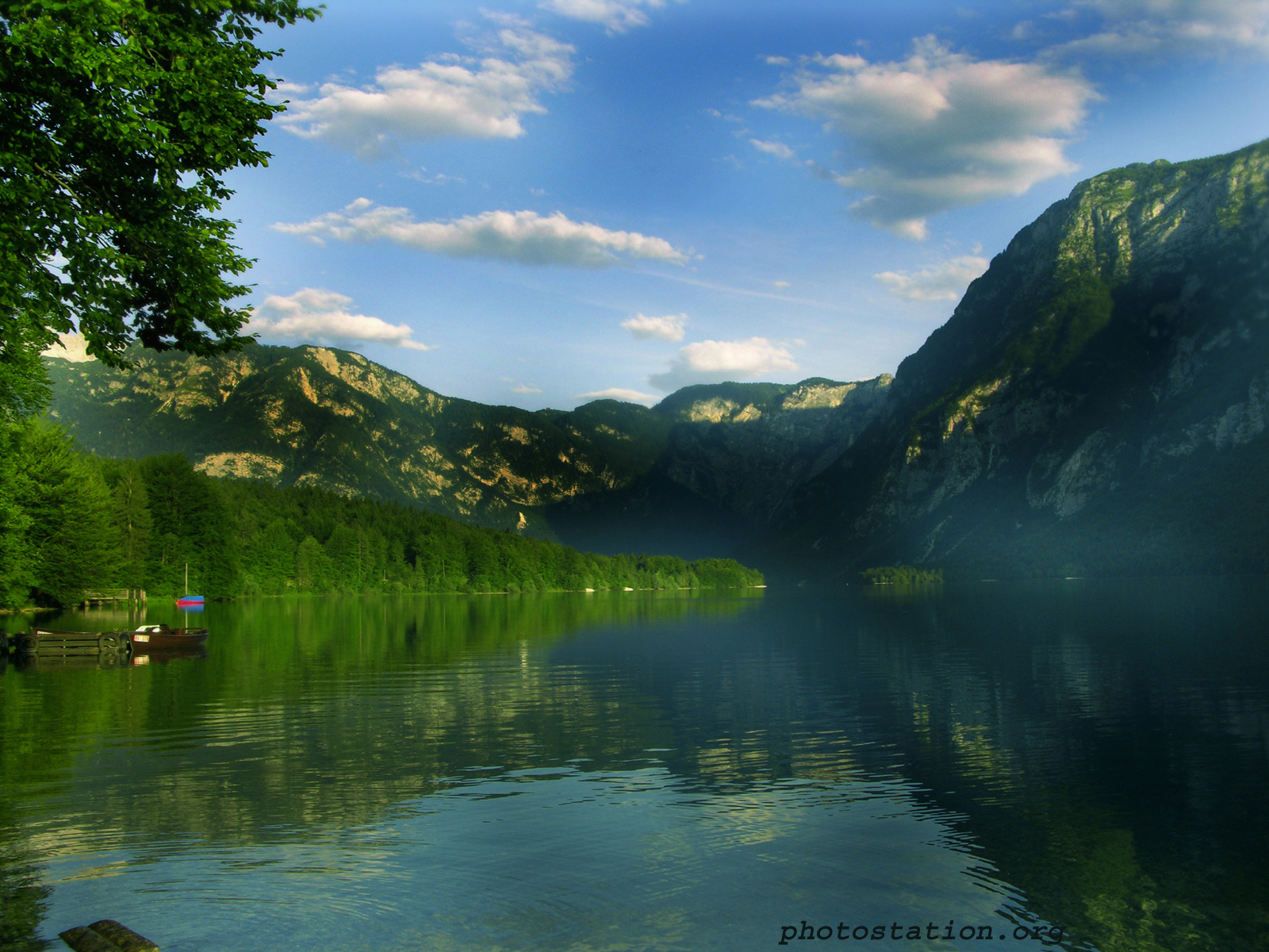 Description: A lake surrounded by mountains and trees with a boat in the water and a few people on the shore.