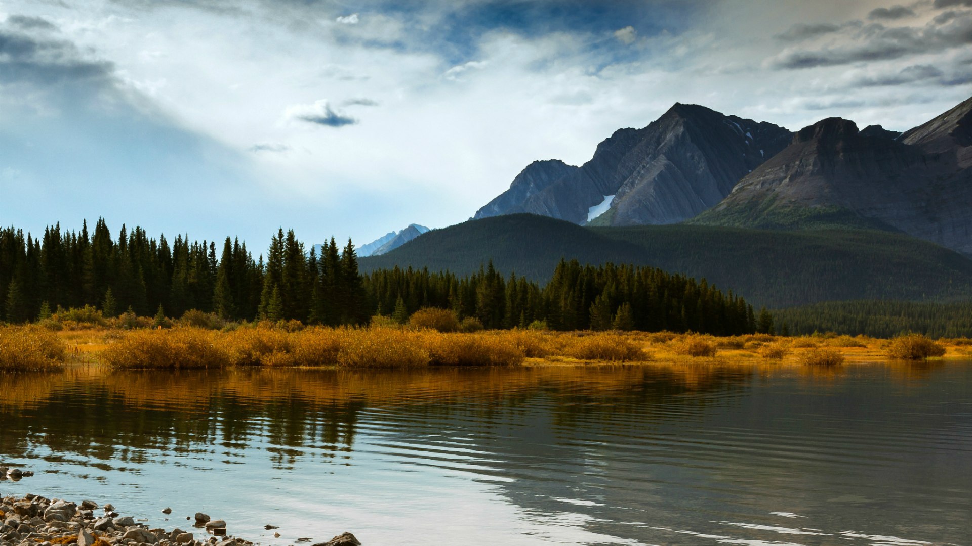 Description: A lake surrounded by mountains and trees with a cloudy sky above it and a few clouds in the sky.