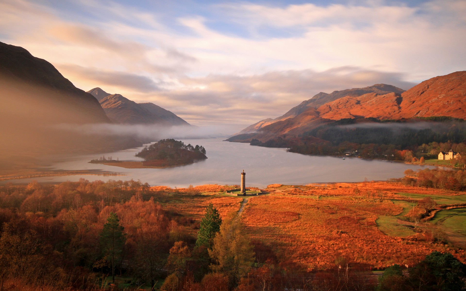 Description: A lake surrounded by mountains and trees in the middle of the day with a foggy sky above it.