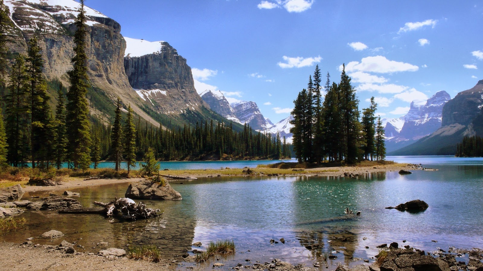Description: A lake surrounded by mountains and trees with a sky background and clouds in the sky above it is a rocky shore and a few trees.