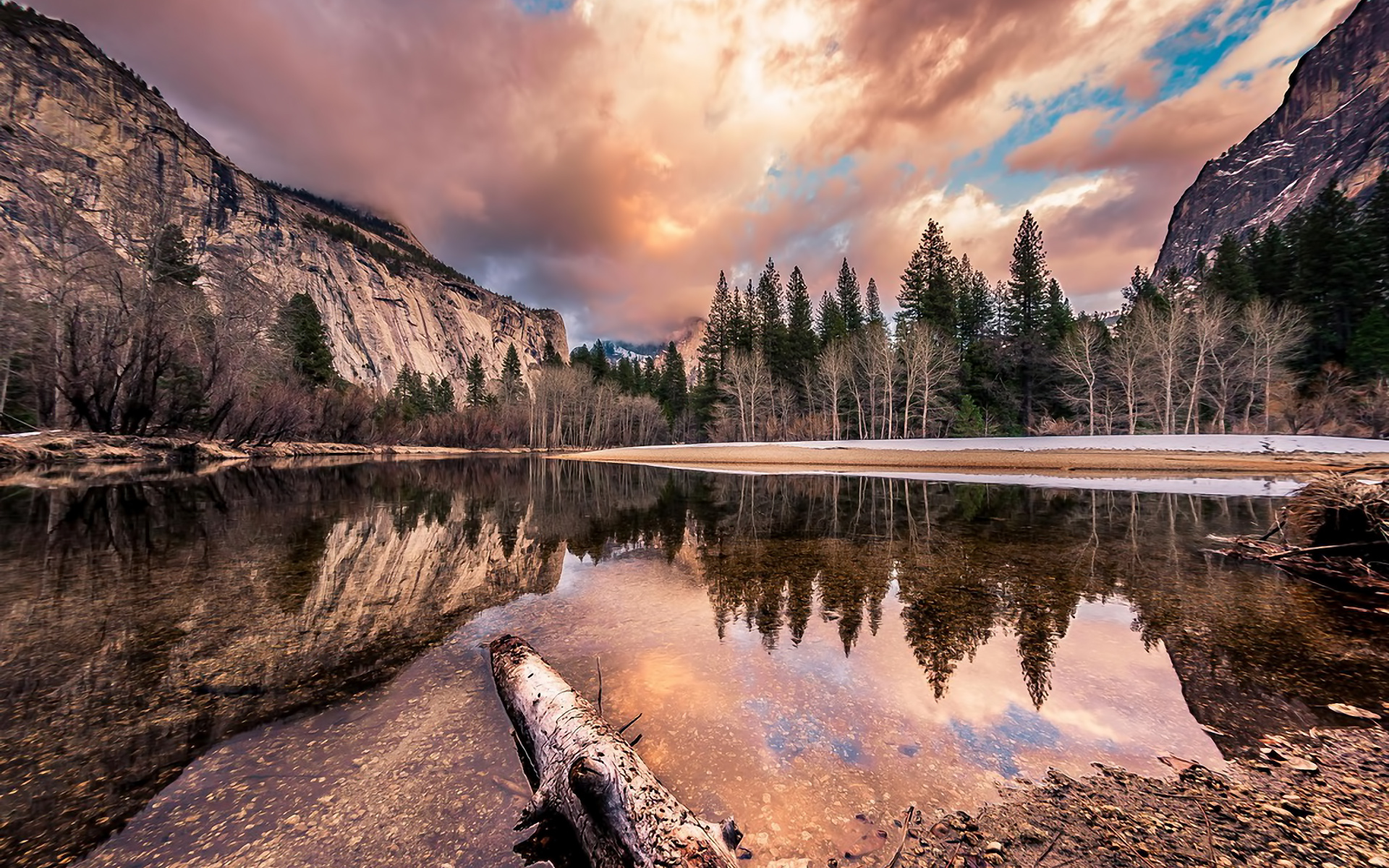 Description: A lake surrounded by mountains and trees under a cloudy sky with a fallen log in the foreground and a fallen tree in the foreground.