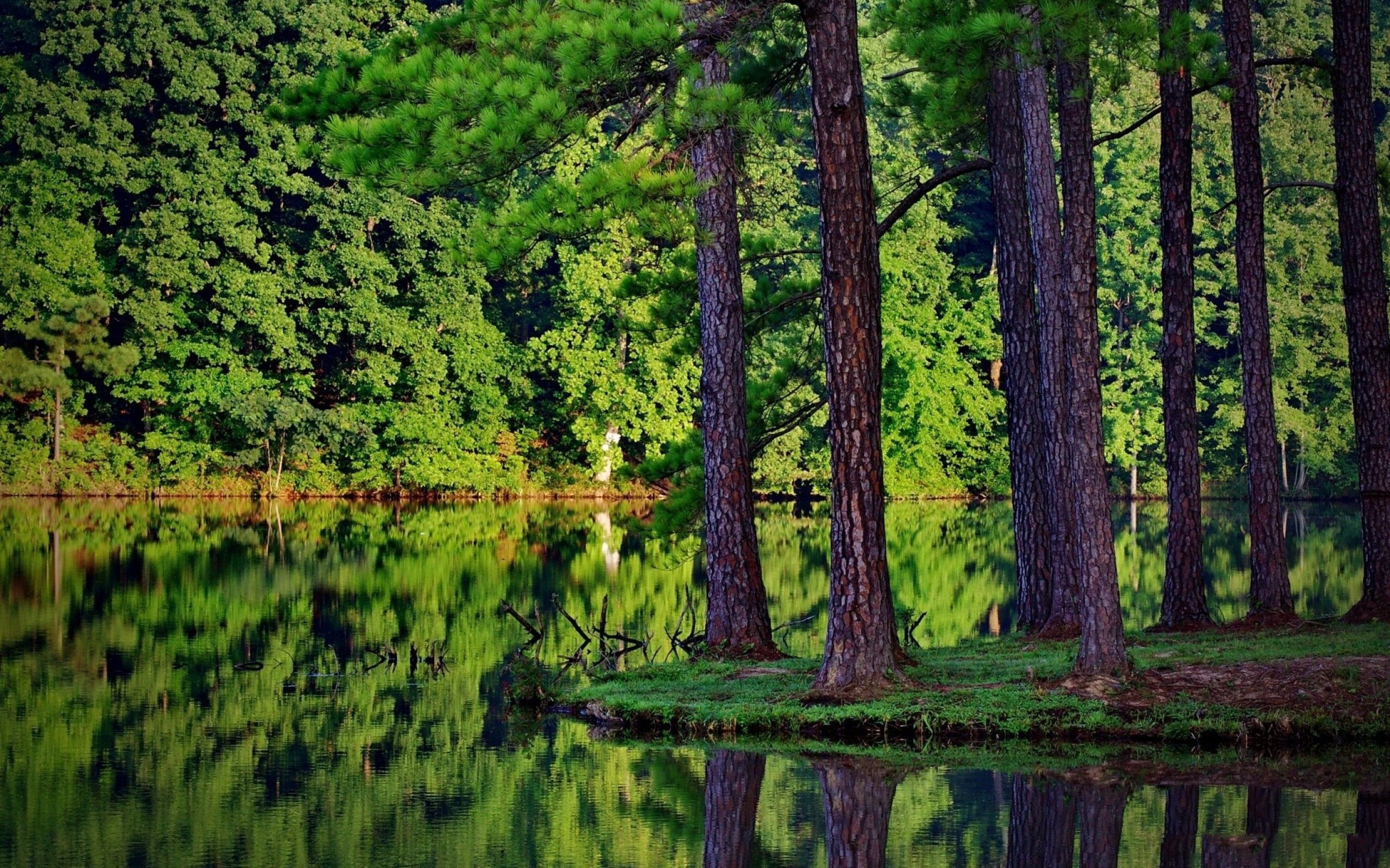 Description: A lake surrounded by trees and grass in the middle of a forest with a reflection of the trees in the water.