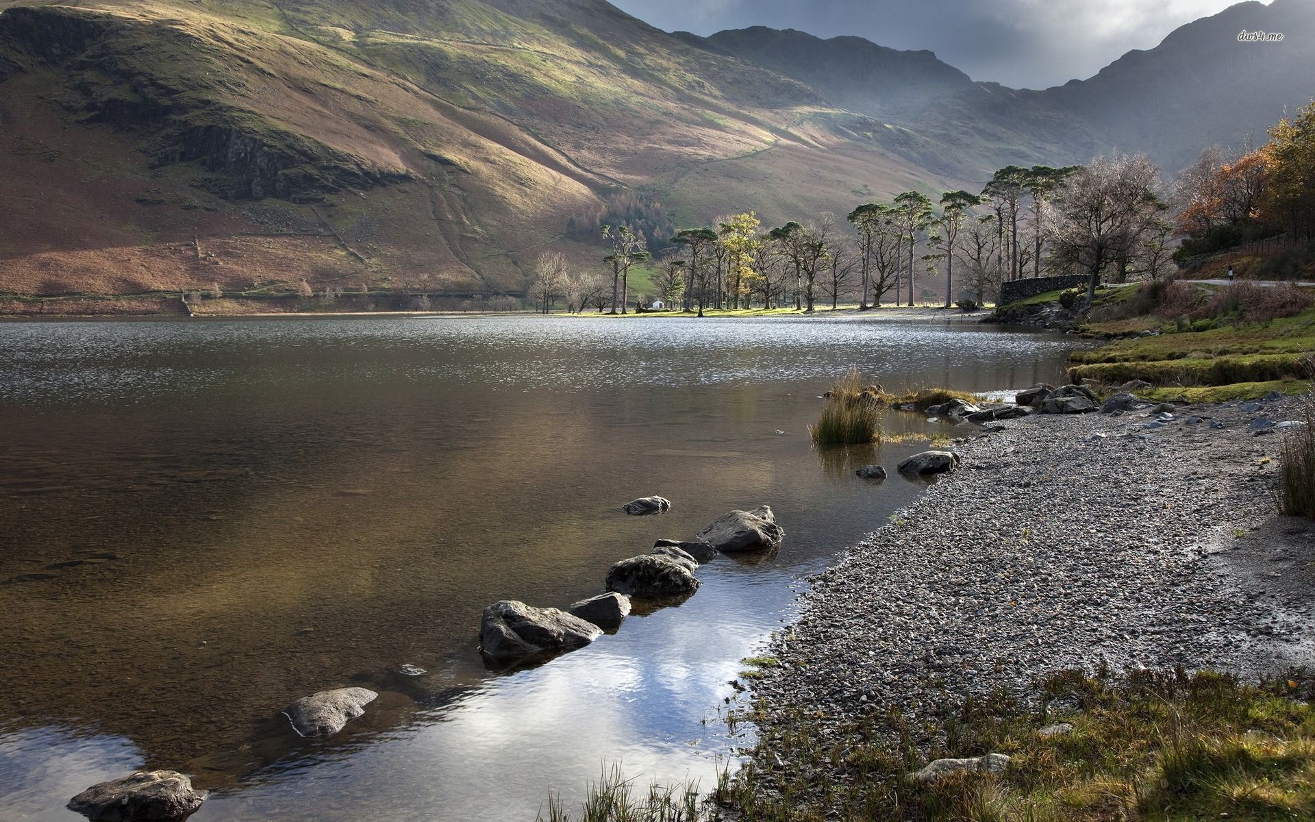 Description: A lake with rocks in the water and mountains in the background with clouds in the sky and a few trees.