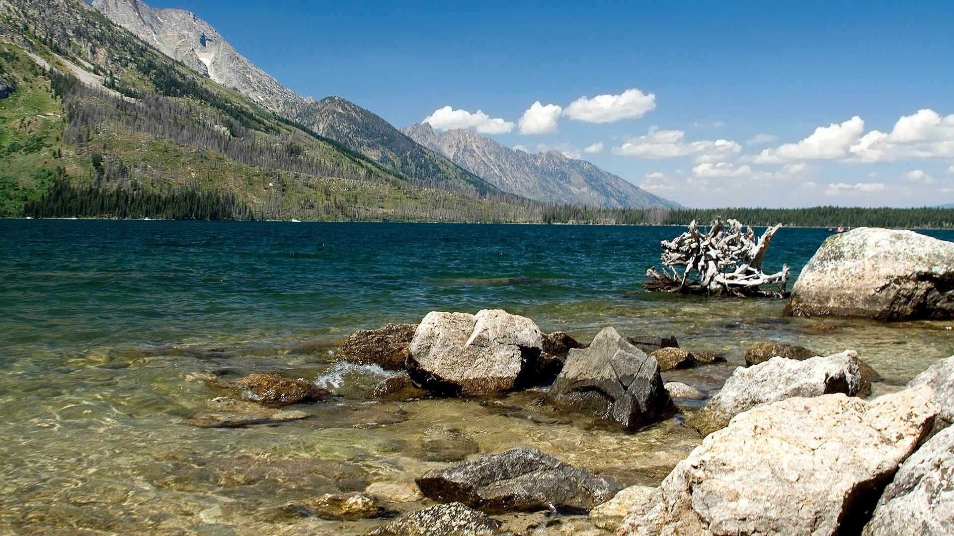 Description: A lake with rocks and a tree in the water and mountains in the background with clouds in the sky.