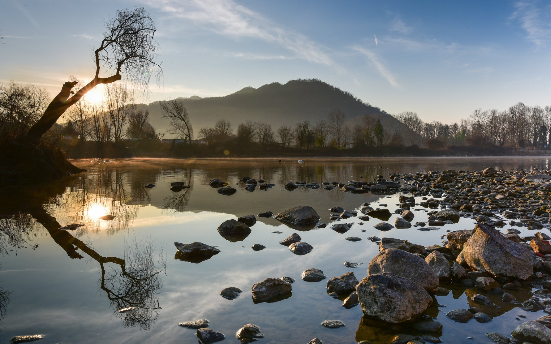 Description: A lake with rocks and a tree in the foreground and a mountain in the background with a sun setting.