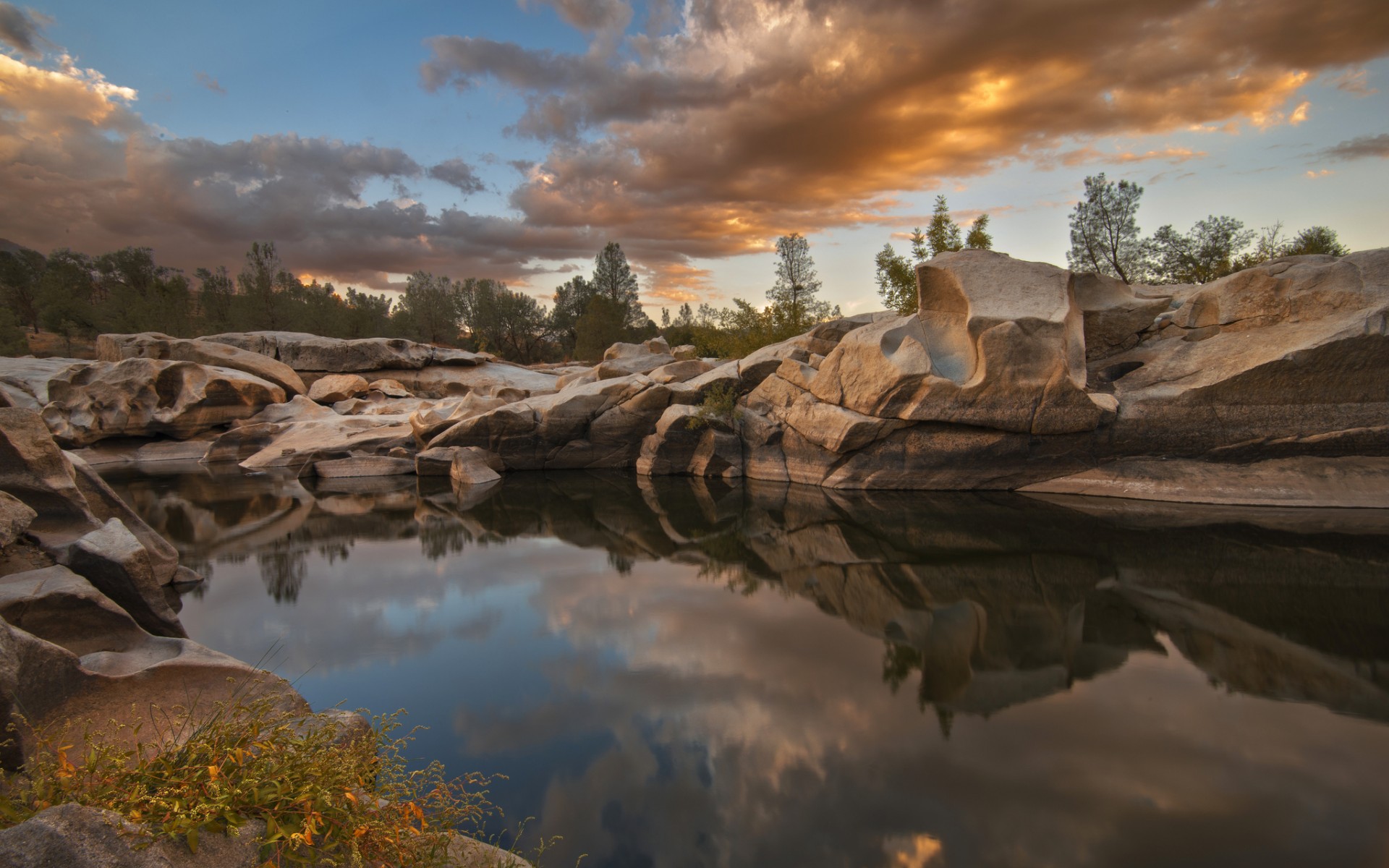 Description: A lake surrounded by rocks and trees under a cloudy sky with clouds above it and a few trees in the distance.