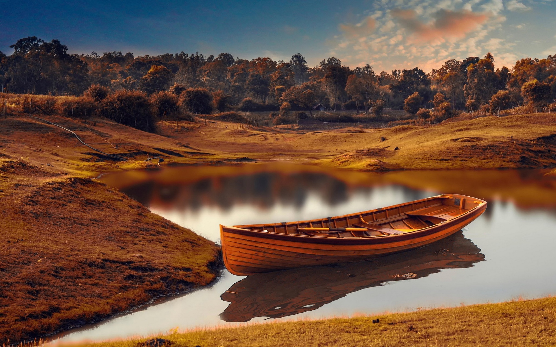 Description: A boat is sitting on the shore of a lake in the fall time.