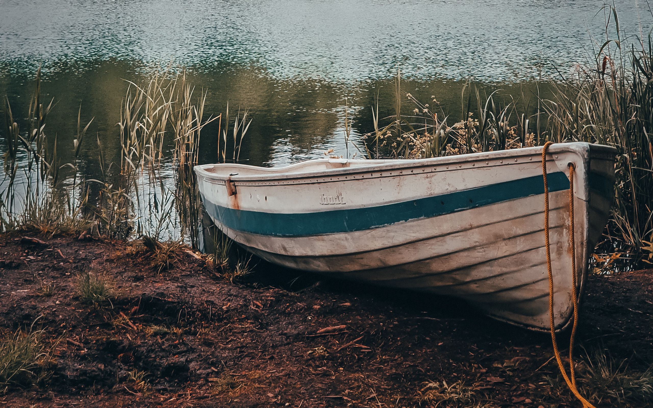 Description: A boat sitting on the shore of a lake near tall grass and reeds in the water.