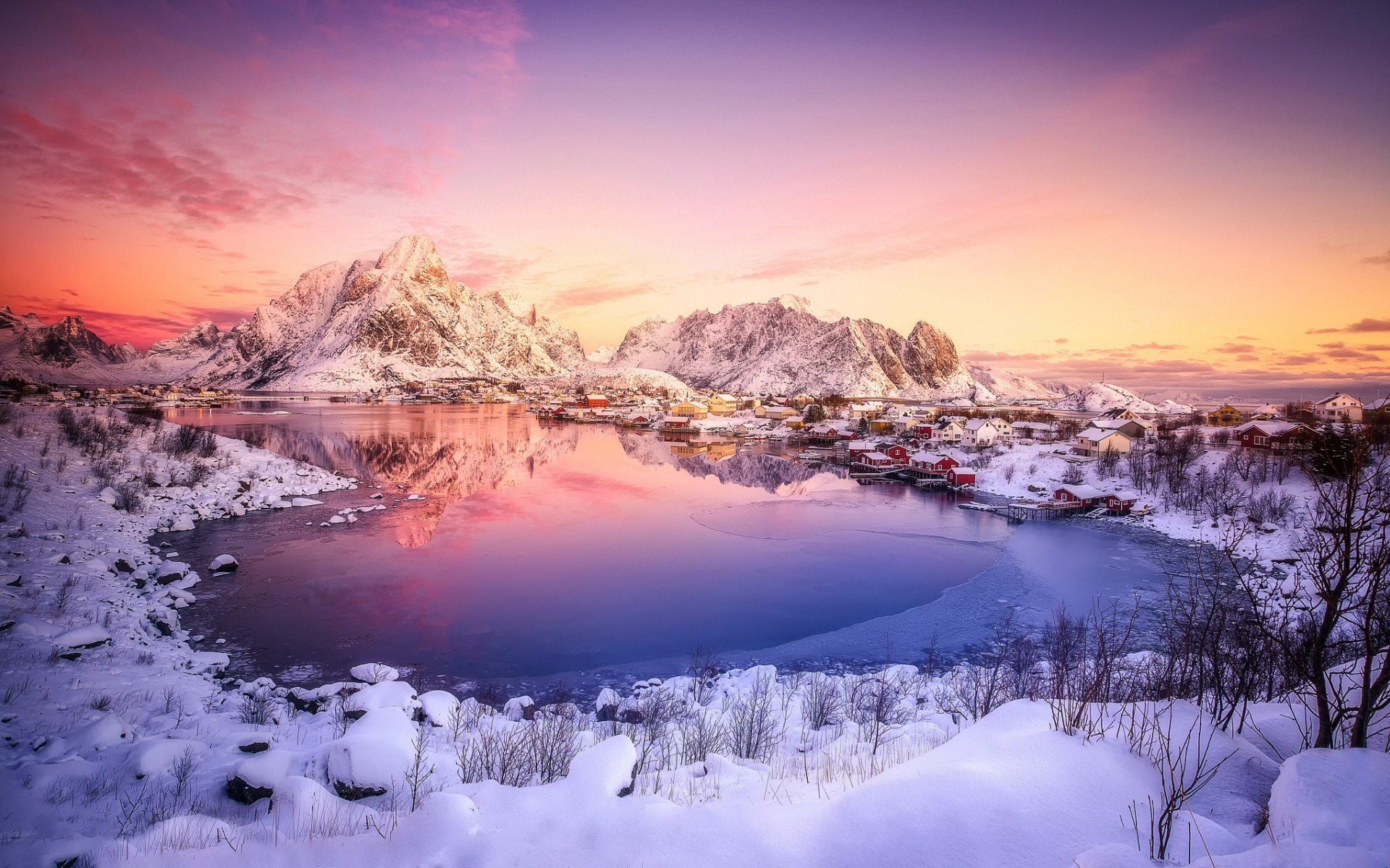Description: A lake surrounded by snow covered mountains and a town in the distance with a sunset in the background and a pink sky.
