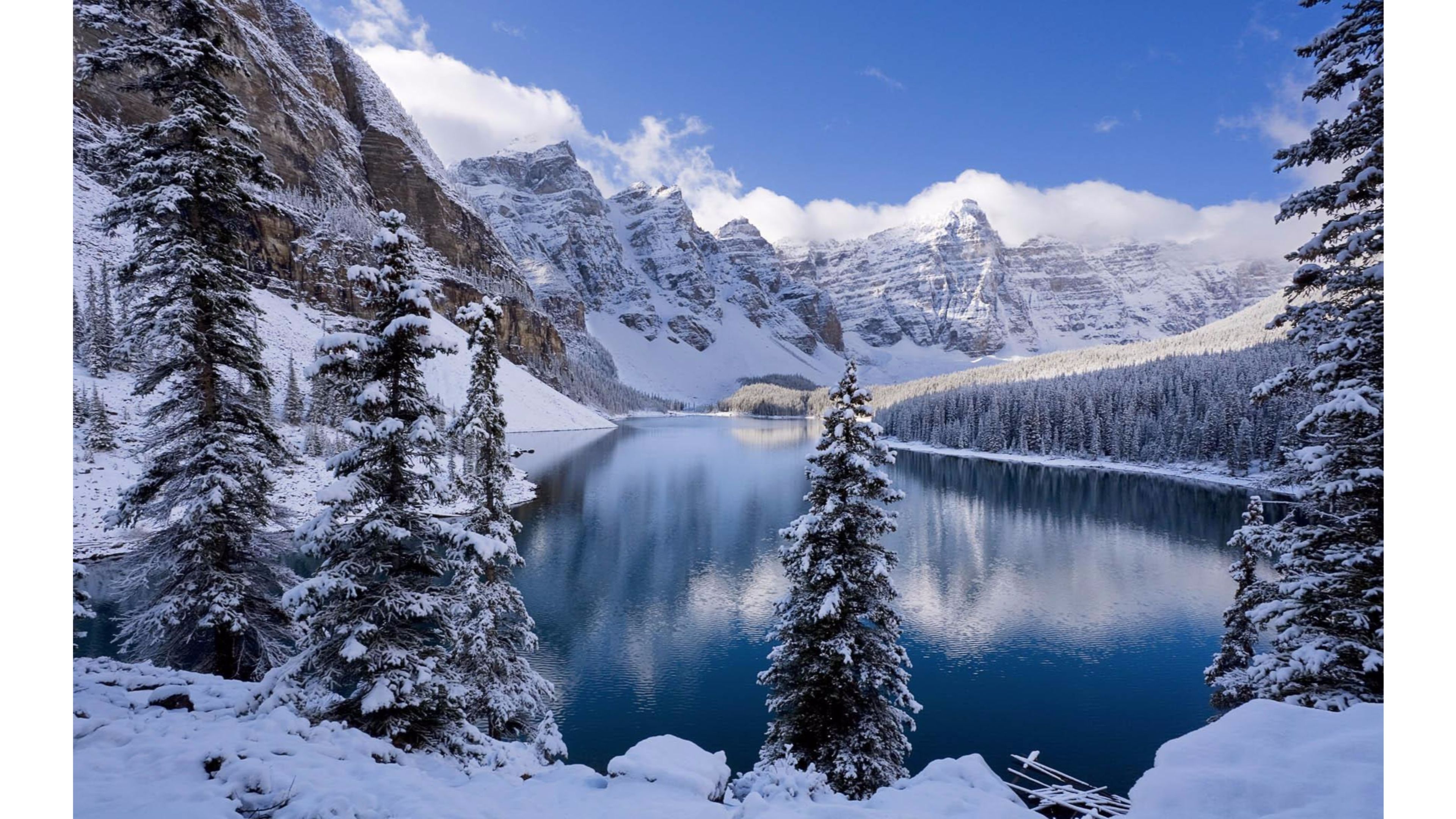 Description: A lake surrounded by snow covered mountains and trees in the foreground is a mountain range with snow covered mountains in the background.