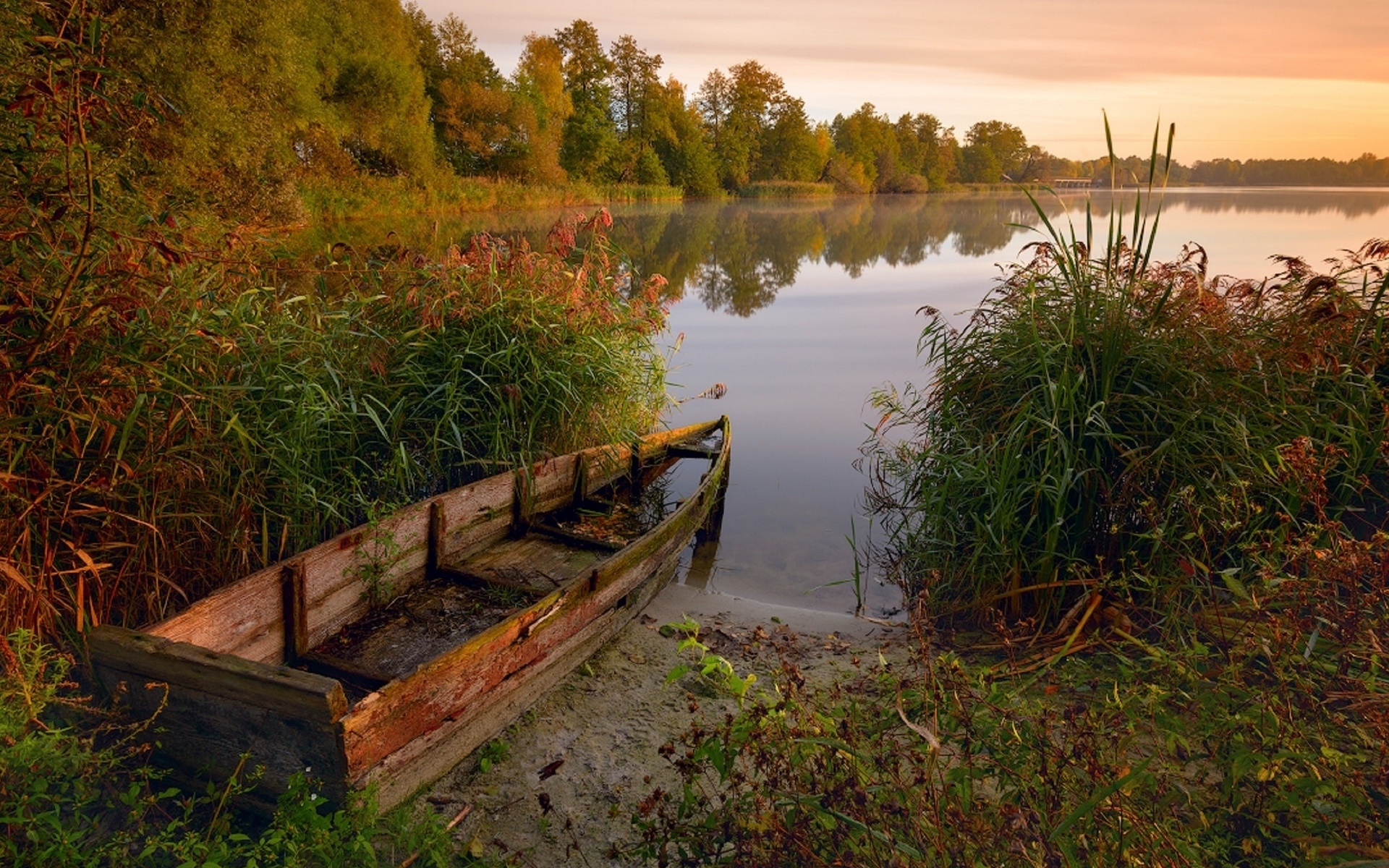 Description: A boat sitting on the shore of a lake at sunset or dawn with a few clouds in the sky.
