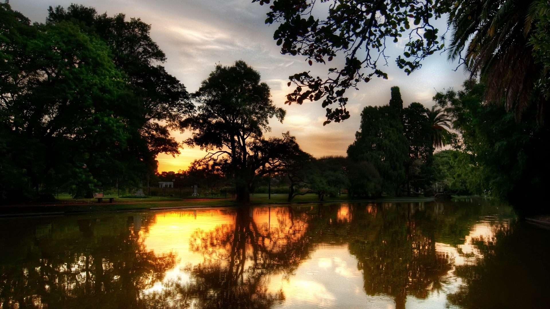 Description: A lake with trees and a sunset in the background with clouds in the sky and a few clouds in the water.