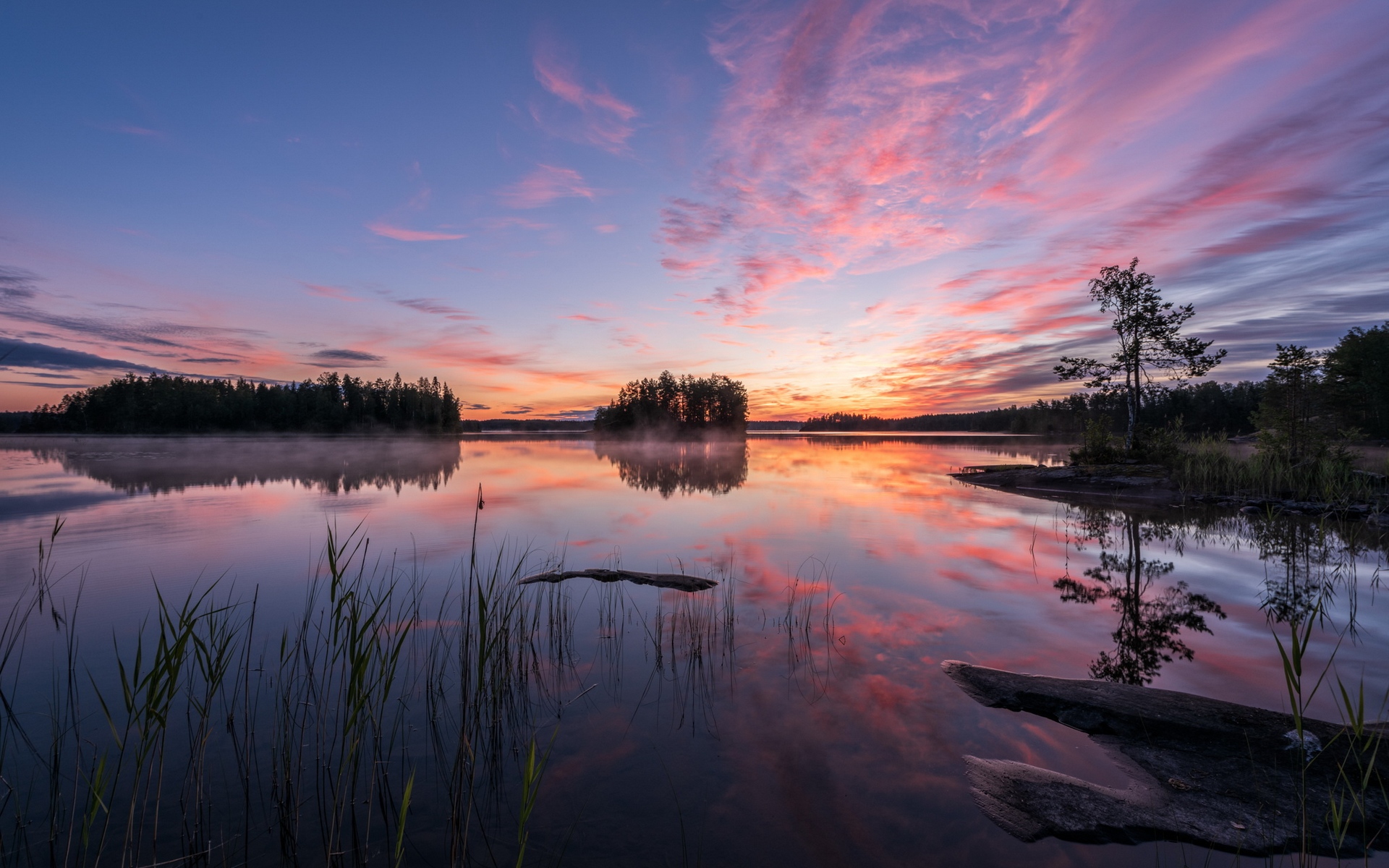 Description: A lake with a sunset in the background and some trees in the foreground and a few clouds in the sky.