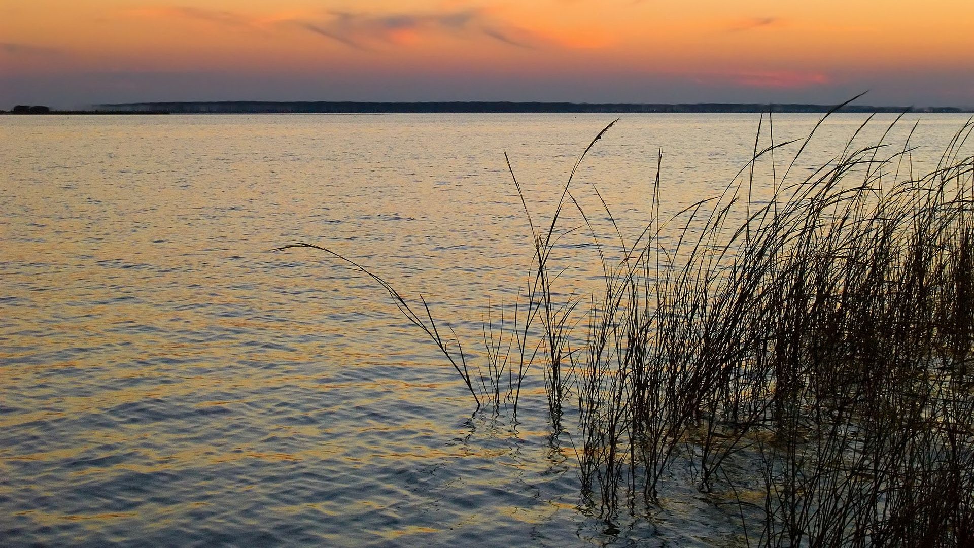 Description: A body of water with a bunch of tall grass in the foreground and a sunset in the background.
