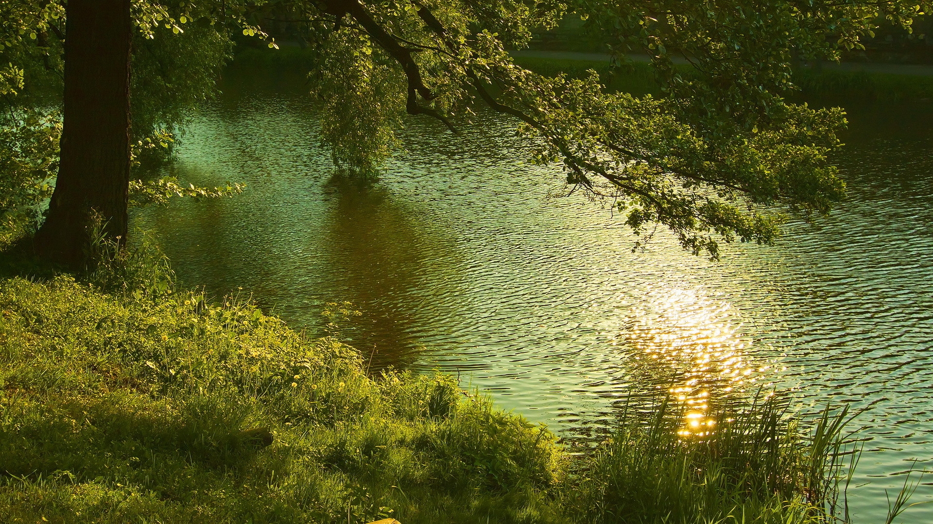 Description: A lake with a tree and a bench in the grass near it and the sun shining through the trees.