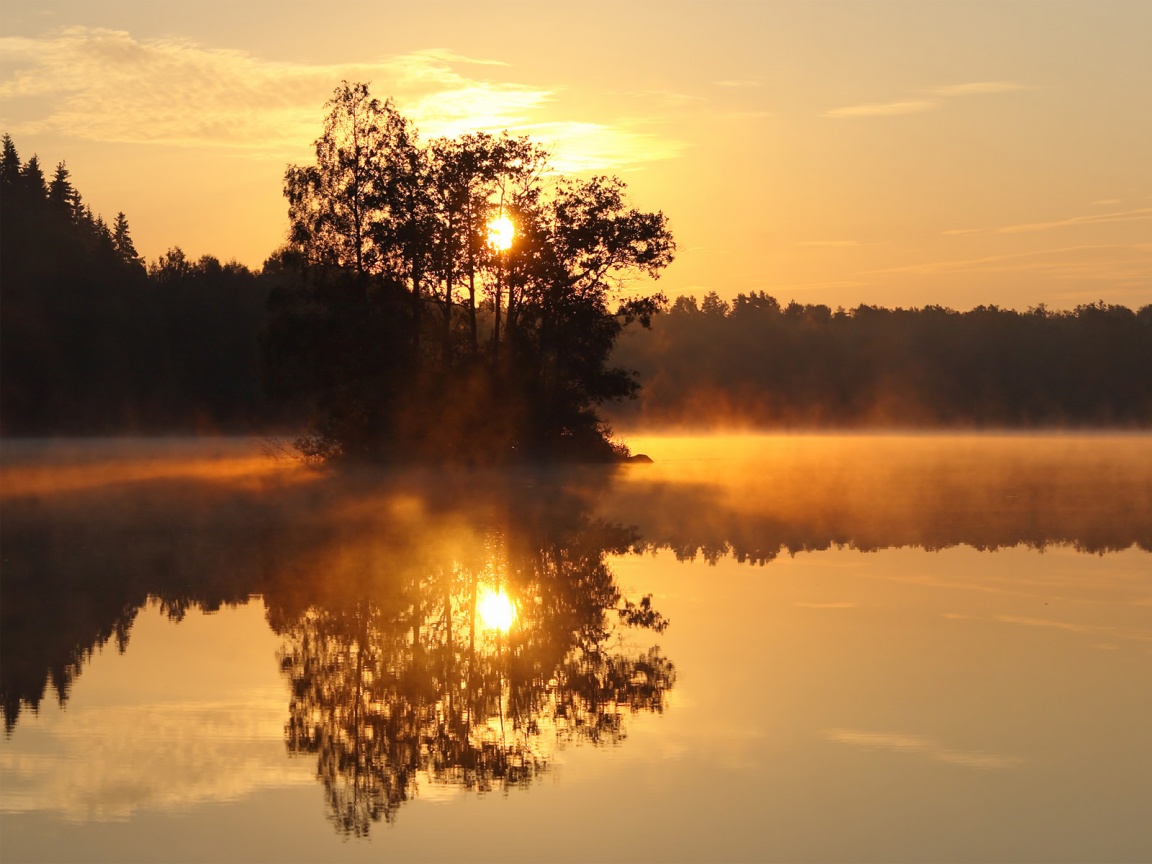 Description: A lake with a tree in the middle of it and a sun setting in the background with fog in the air.