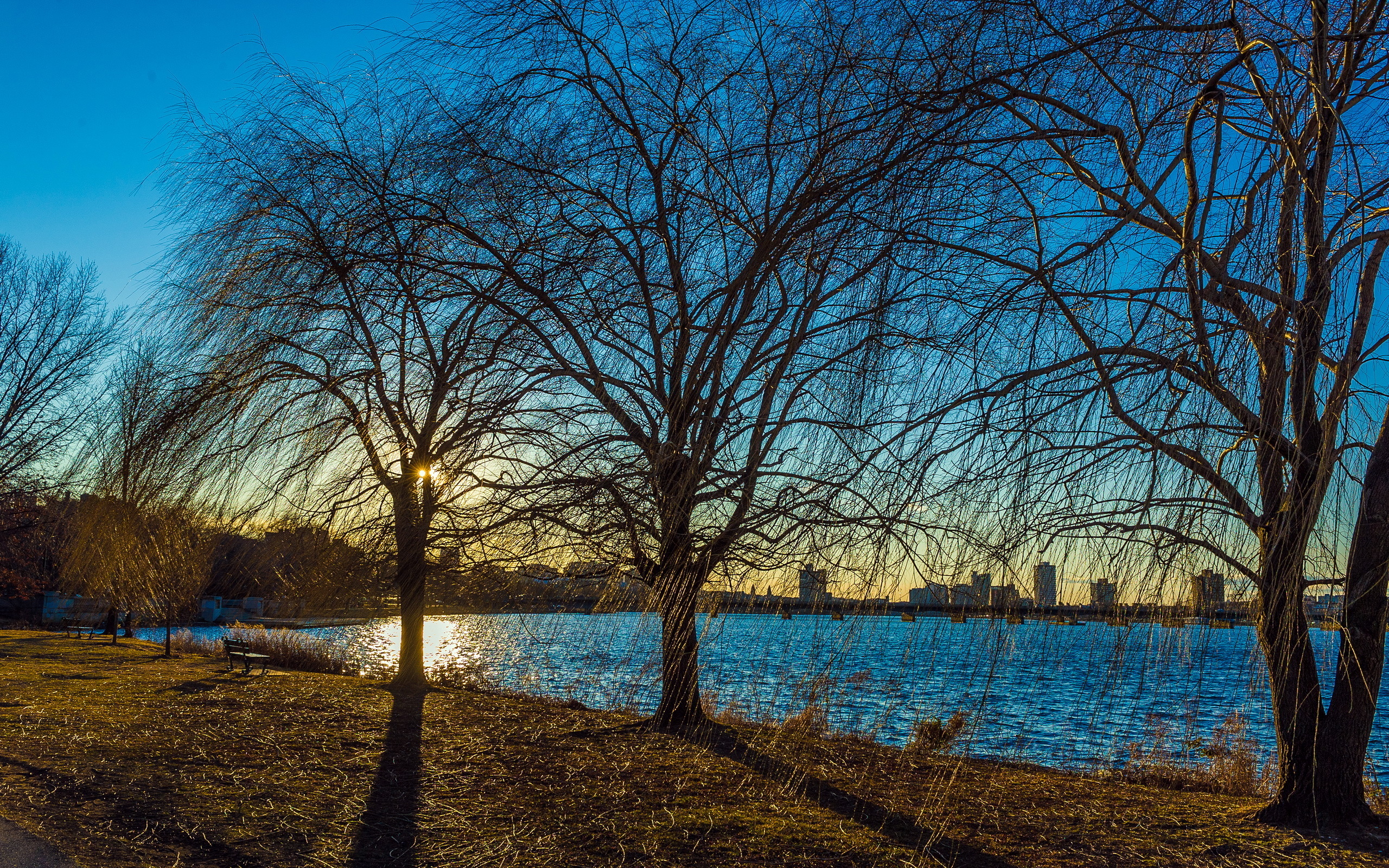 Description: A lake with trees and a bench in the foreground and a city in the background at sunset or dawn.