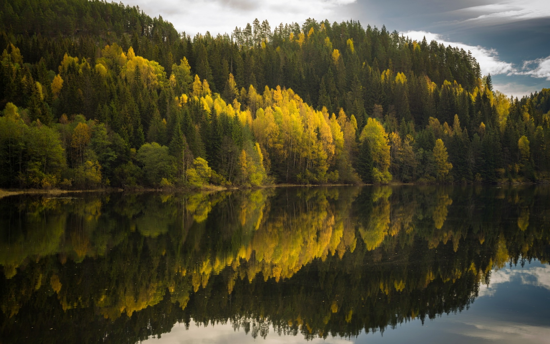 Description: A lake surrounded by trees with a cloudy sky in the background and a few clouds in the sky above.
