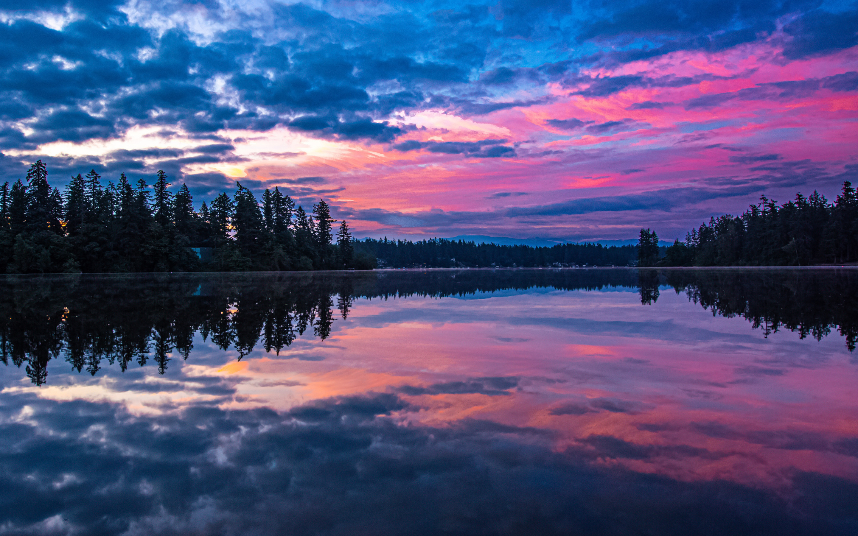 Description: A lake with a lot of trees in the background and a colorful sky above it with clouds and trees.