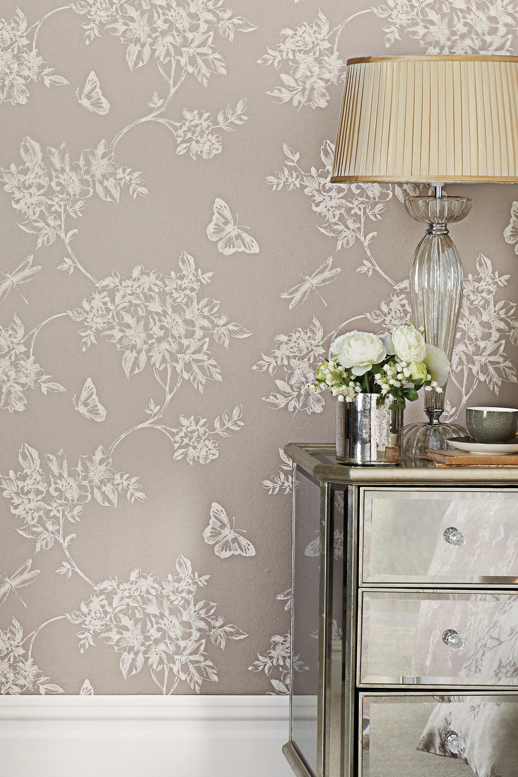 Description: A lamp and a dresser with a lamp on top of it and a flowered wallpaper behind it.